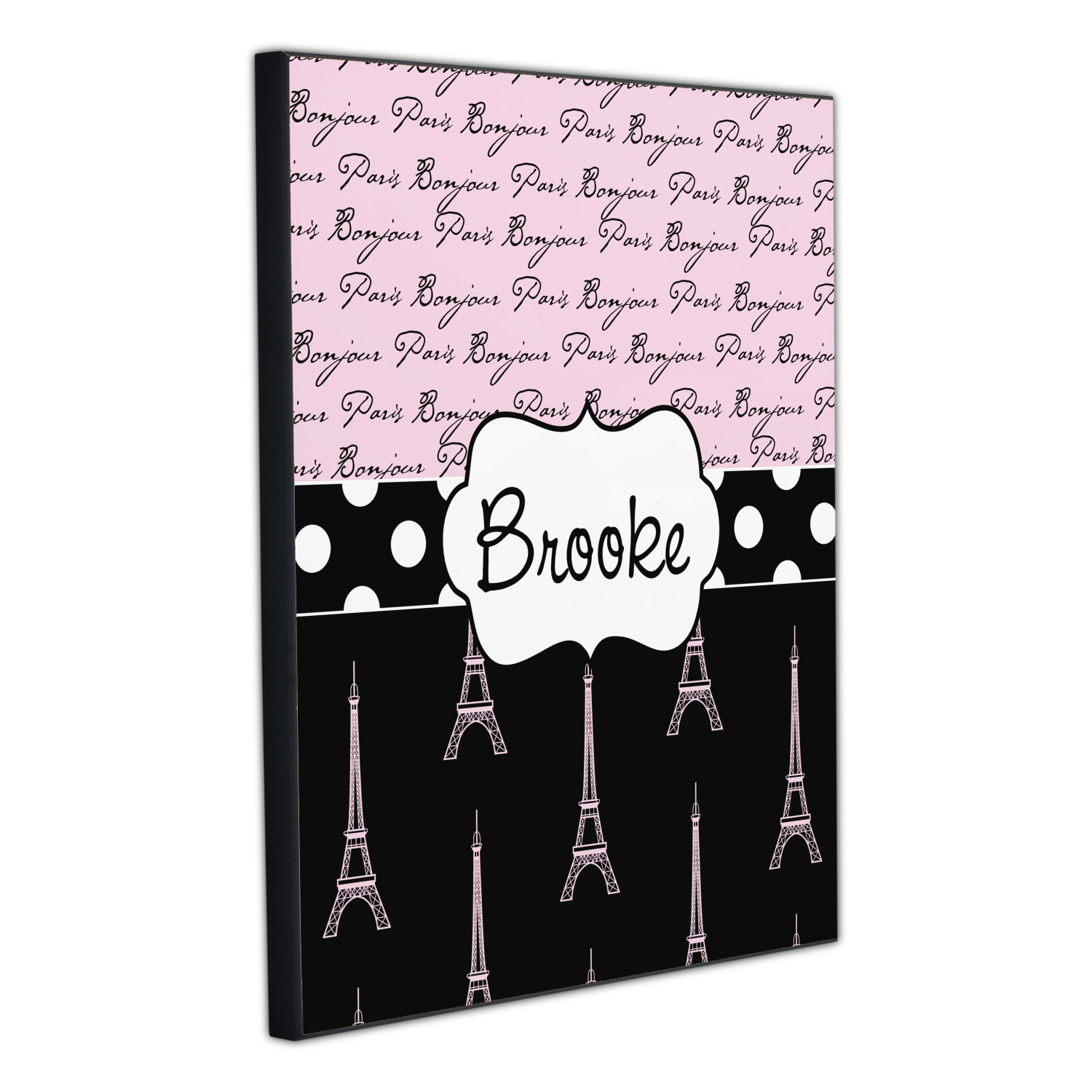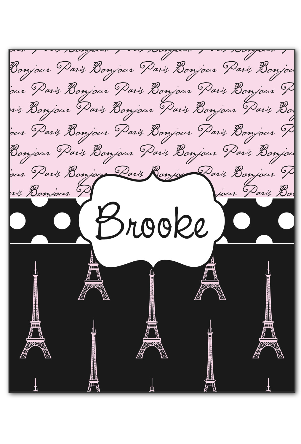 Ooh La La! Add a bit of Parisian elegance to your decor with this gorgeous French Eiffel Tower design. The top of the design features a delicate, soft pink background to feature the words "Bonjour" & "Paris" written in black graphic text. The bottom half of the design a black backdrop is use so that the iconic Eiffel Tower in pink come to life.