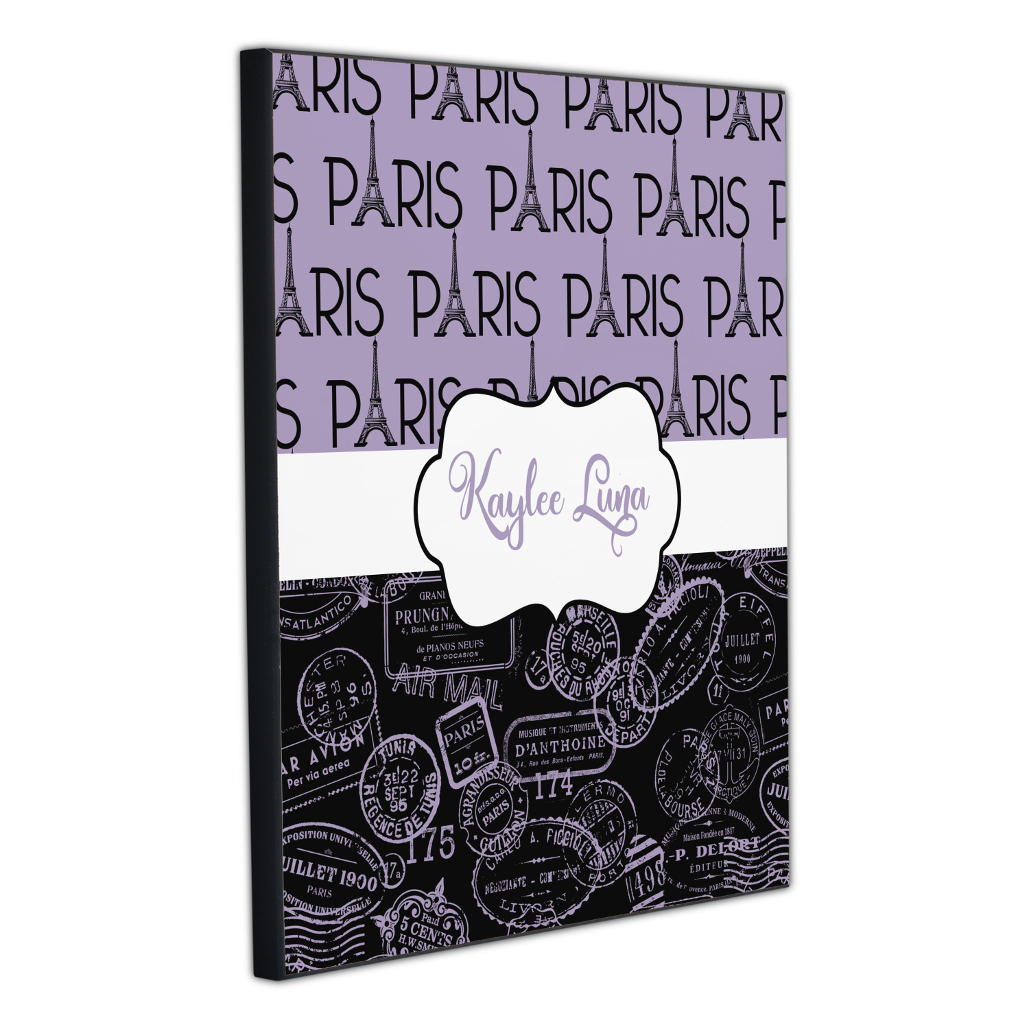 A gorgeous wide black and white polka dot band adds a touch of French whimsy. The beautiful white label highlights the personalization of your choice.