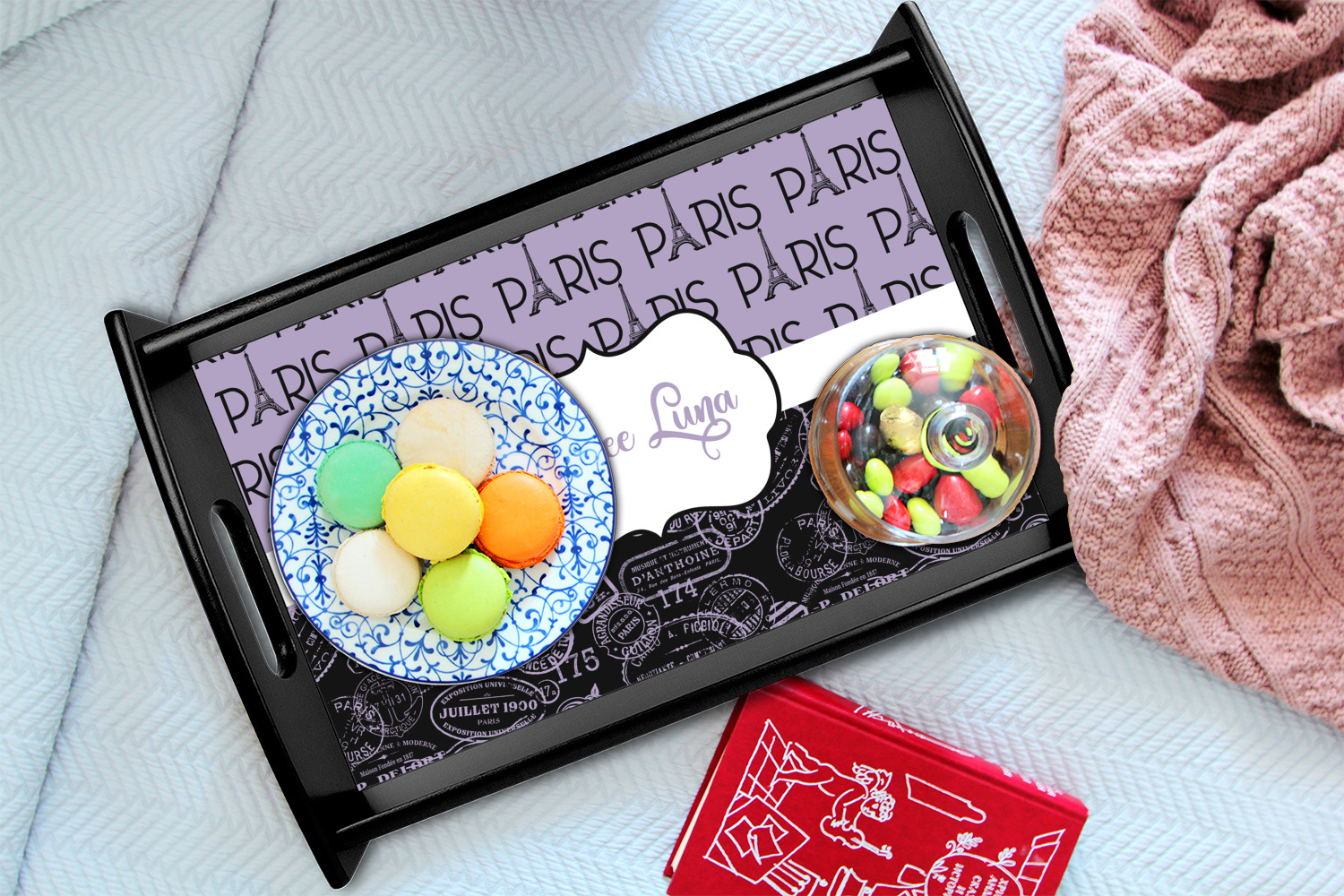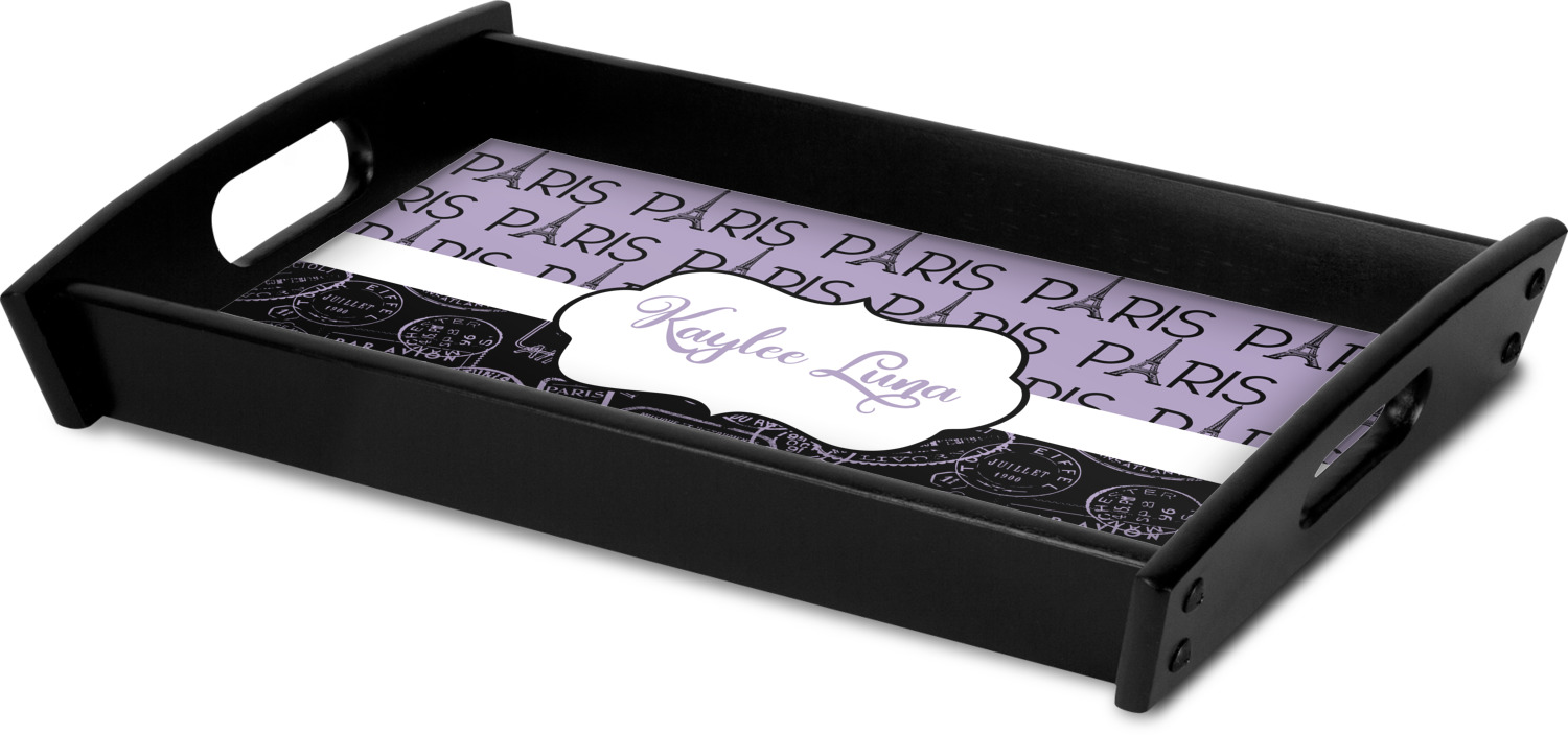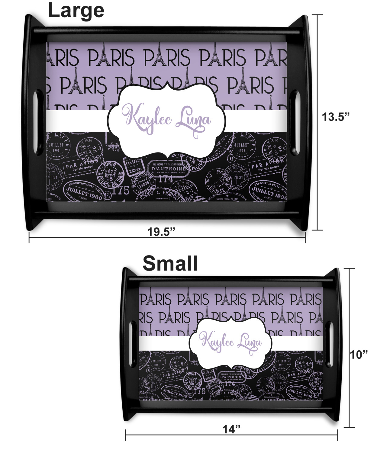 This serving tray with handles features square edges and two rounded sides, creating a very modern look. Each side is fabricated from a beautifully cut, natural wood. The bottom of the interior of the tray displays your customized design in bright, vibrant color. The tray is sold in both a black color and a natural wood look. Each variation of the wood serving tray has two sizes: Small, which is 14" x 10" x 2.25", and Large, which is 19.5" x 13.5" x 2.75".