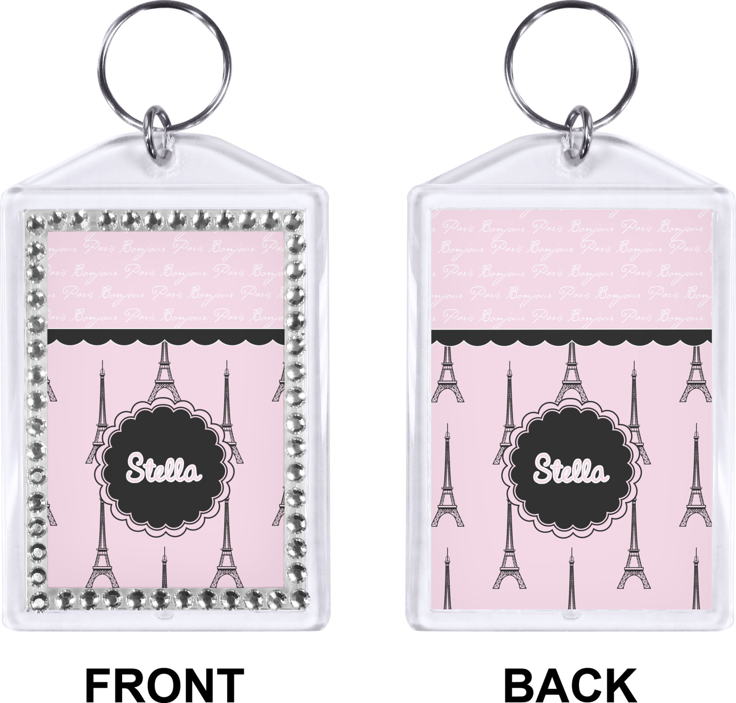 Our personalized keychains have a bold, rectangular shape, outlined by a series of shimmering rhinestones. A metal, split keyring is included with your purchase, and an additional metal hoop allows for attachment of the keychain to the split ring. This unique keychain measures at about 3.75 by 2.5 inches. We print your customized design(s) across both the back and front of this keychain.