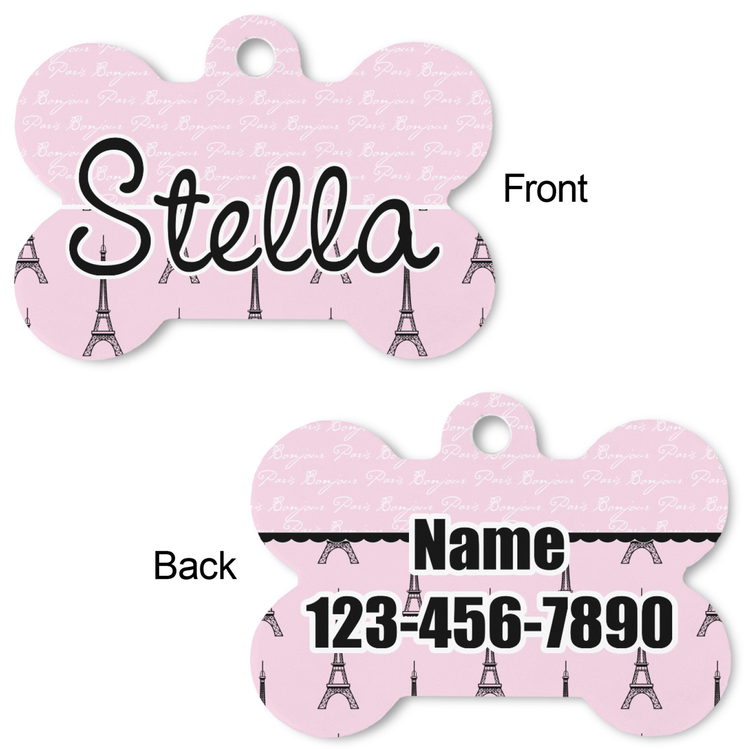 Our default design templates print your dog's personalization on the front and your contact information on the back; however everything is customizable, so you customize the patterns, the colors, the personalization, the contact information etc.