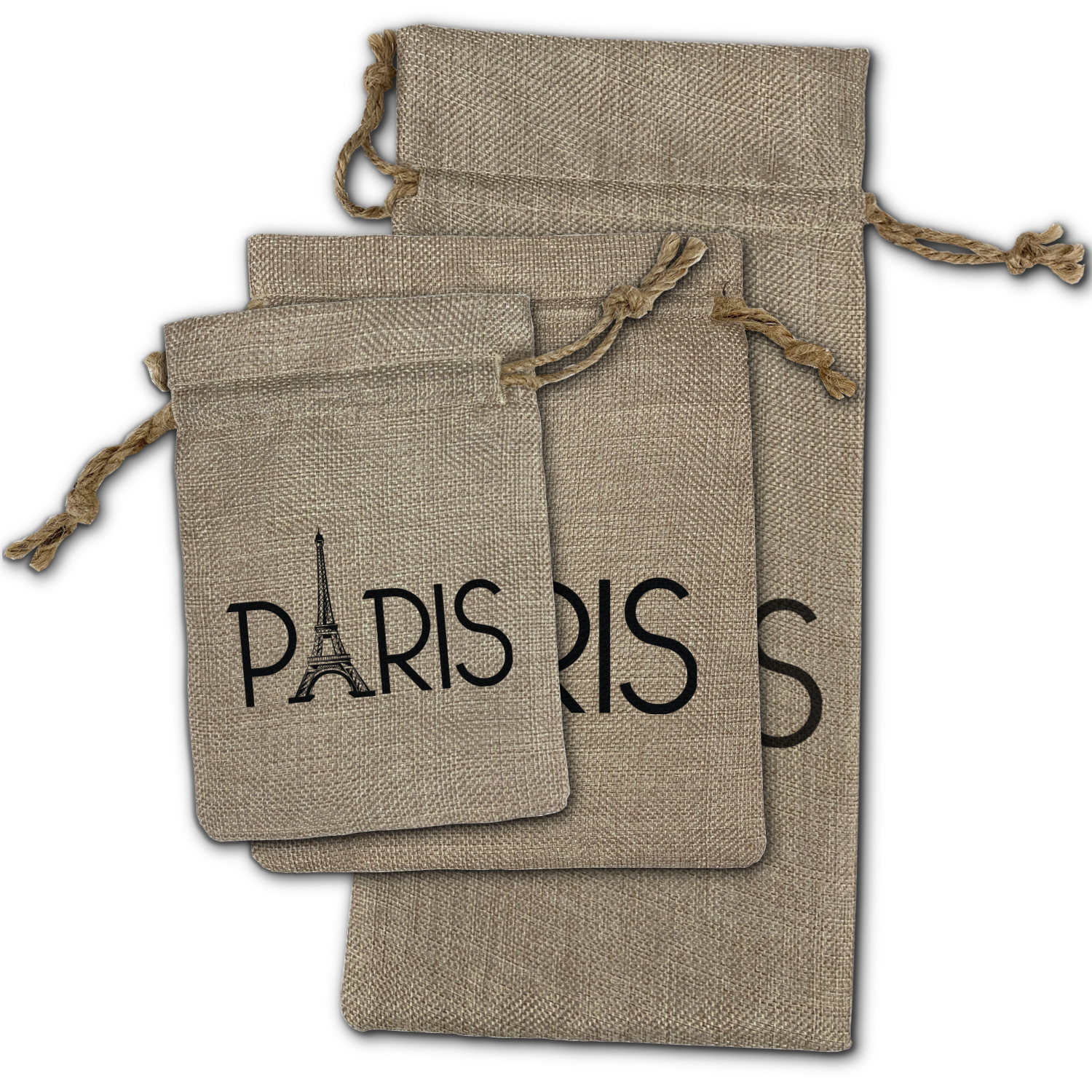 We sell our Burlap Gift Bags in 3 variant sized bags. Made with burlap polyester, each personalized bag can be secured with a twine drawstring pull. Your custom design is available to print on one side or both sides - completely up to you! The sizes of the bags measure approximately 4.5" x 6.5" for the smallest size, 6.5" x 8.0" for the medium size, and 6.5" x 13.5" for the large-sized bag.