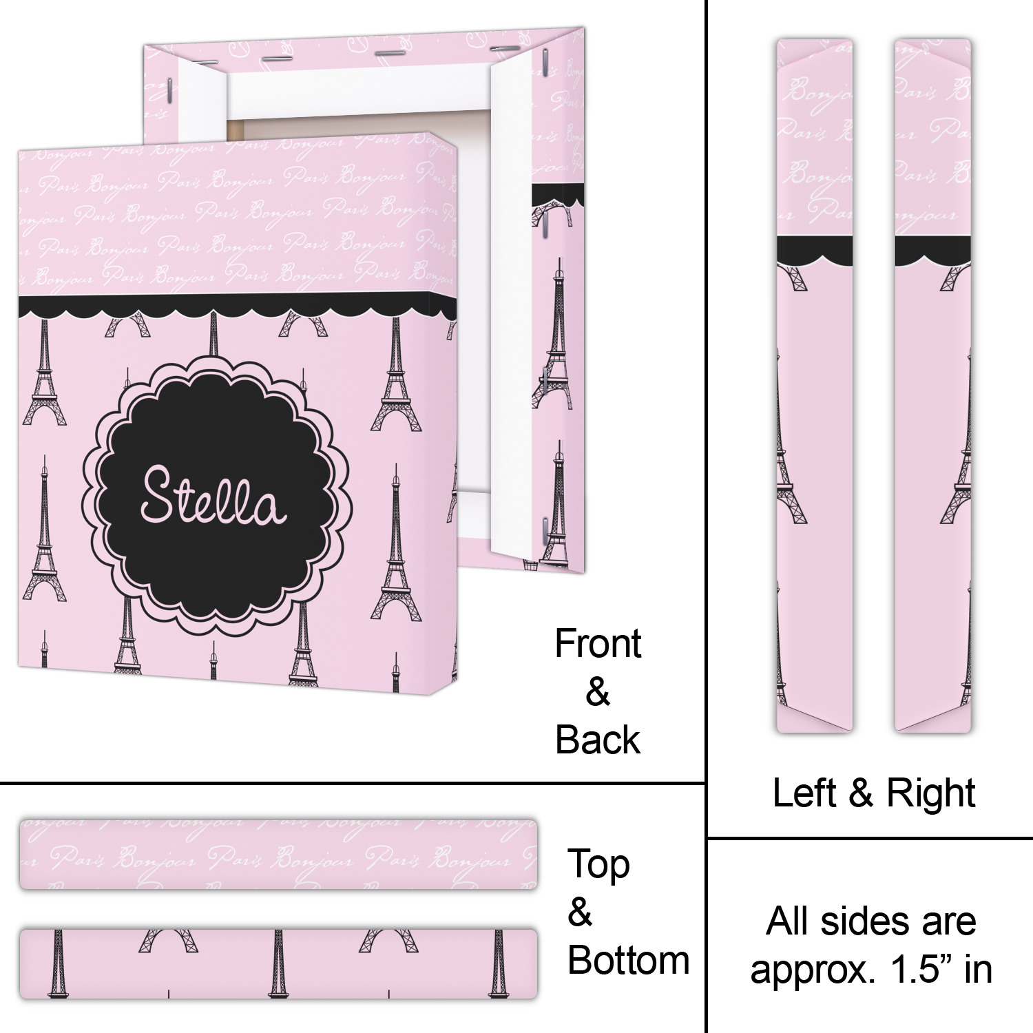 "Bonjour, Paris!" will be the first words spoken when you see this beautiful French inspired design. You will bring a bit of Parisian elegance to your decor when choosing this gorgeous French Eiffel Tower design set on a pretty pink backdrop. The beautiful black scalloped label on the whimsical pink highlights the personalization of your choice.