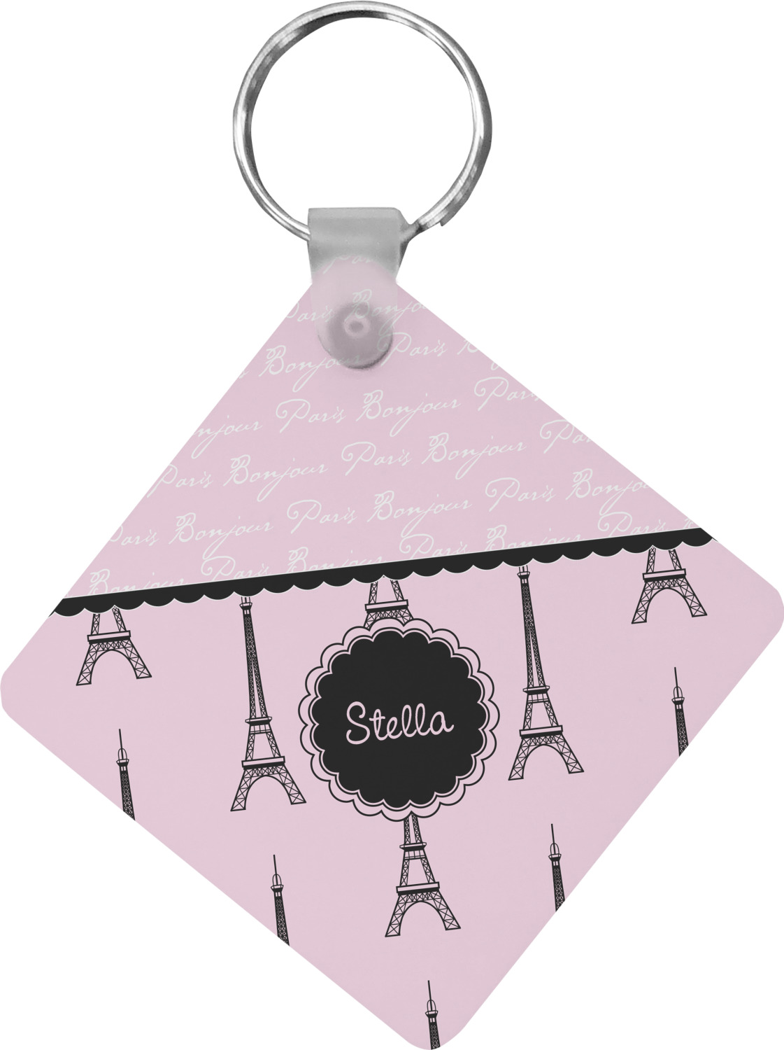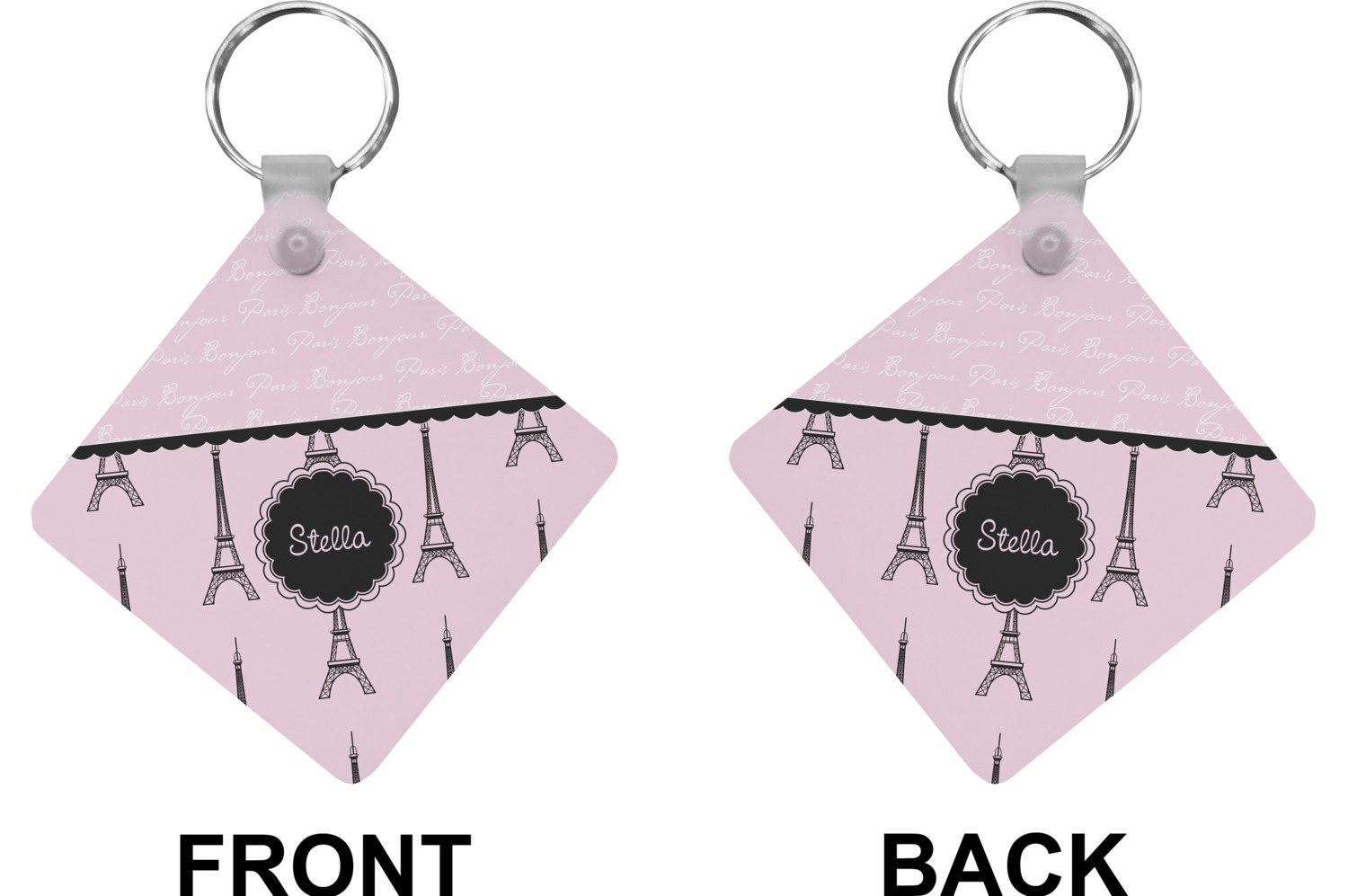Our personalized keychains attach to the included metal, split key ring with a plastic, removable snap. Since a metal ring is included with your purchase, you have the liberty to keep your keys together on the ring, with or without your unique keychain. We offer this keychain in three different shapes: circle, heart, or diamond. We print your personalized design(s) on both sides of the key chain, and the surface has a glossy, reflective finish that only emphasizes your design. Each keychain is approximately 2.25 by 2.25 inches.