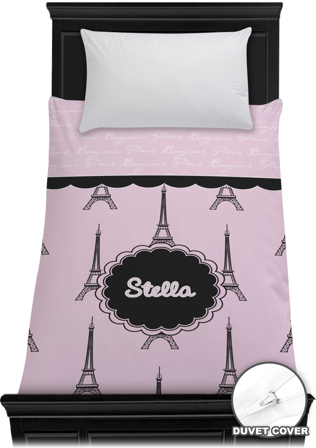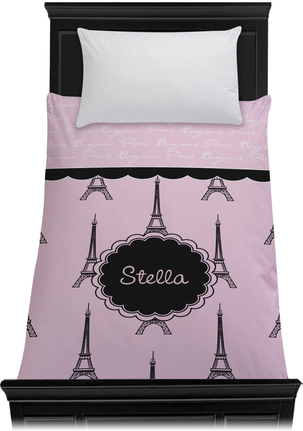 "Bonjour, Paris!" will be the first words spoken when you see this beautiful French inspired design. You will bring a bit of Parisian elegance to your decor when choosing this gorgeous French Eiffel Tower design set on a pretty pink backdrop. The beautiful black scalloped label on the whimsical pink highlights the personalization of your choice.