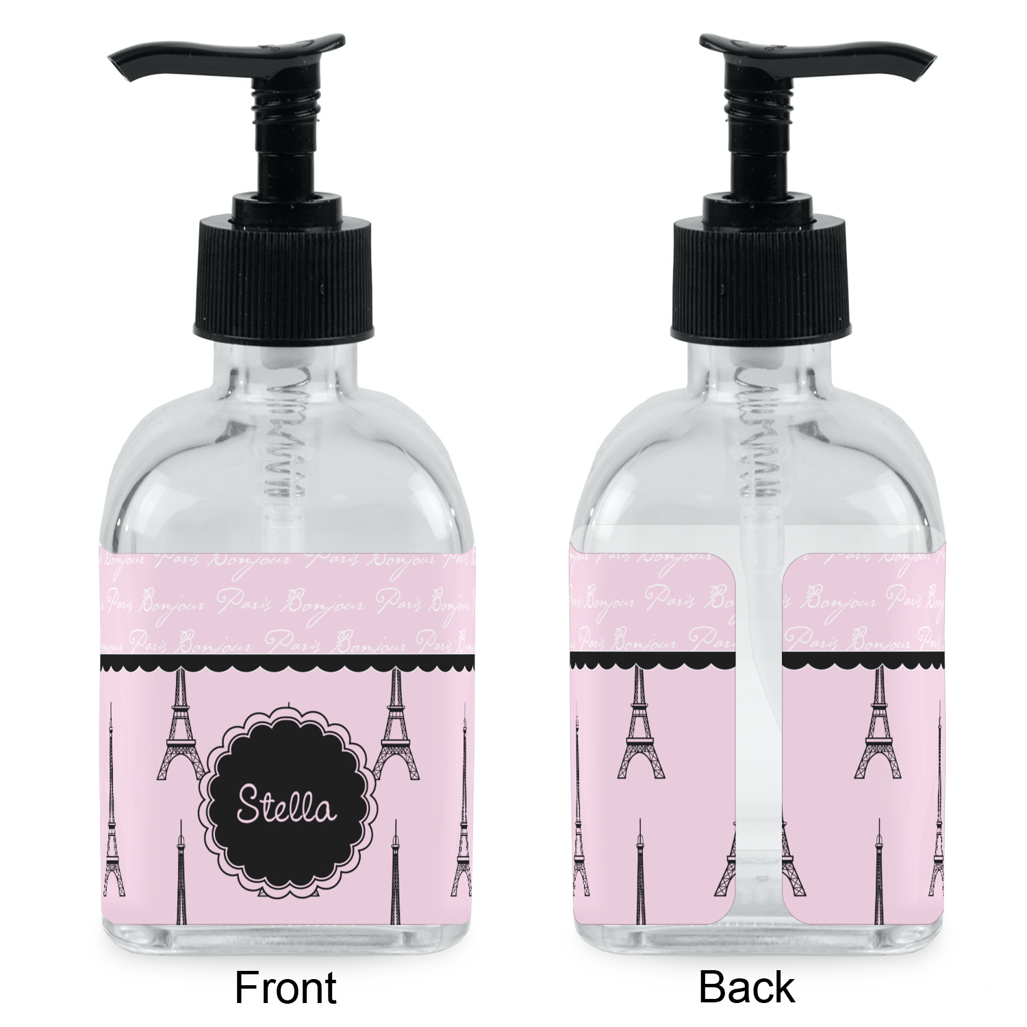 Crafted from a high-quality glass, these soap dispensers and lotion dispensers are durable and robust, while still looking elegant. They are sold with black pumps. Each soap dispenser pump measures at 6.5 by 2.25 inches. On these soap pumps, we display your customized design on a personalized vinyl adhesive on three sides. That way, you can judge how much liquid is in the bottles from the back.
