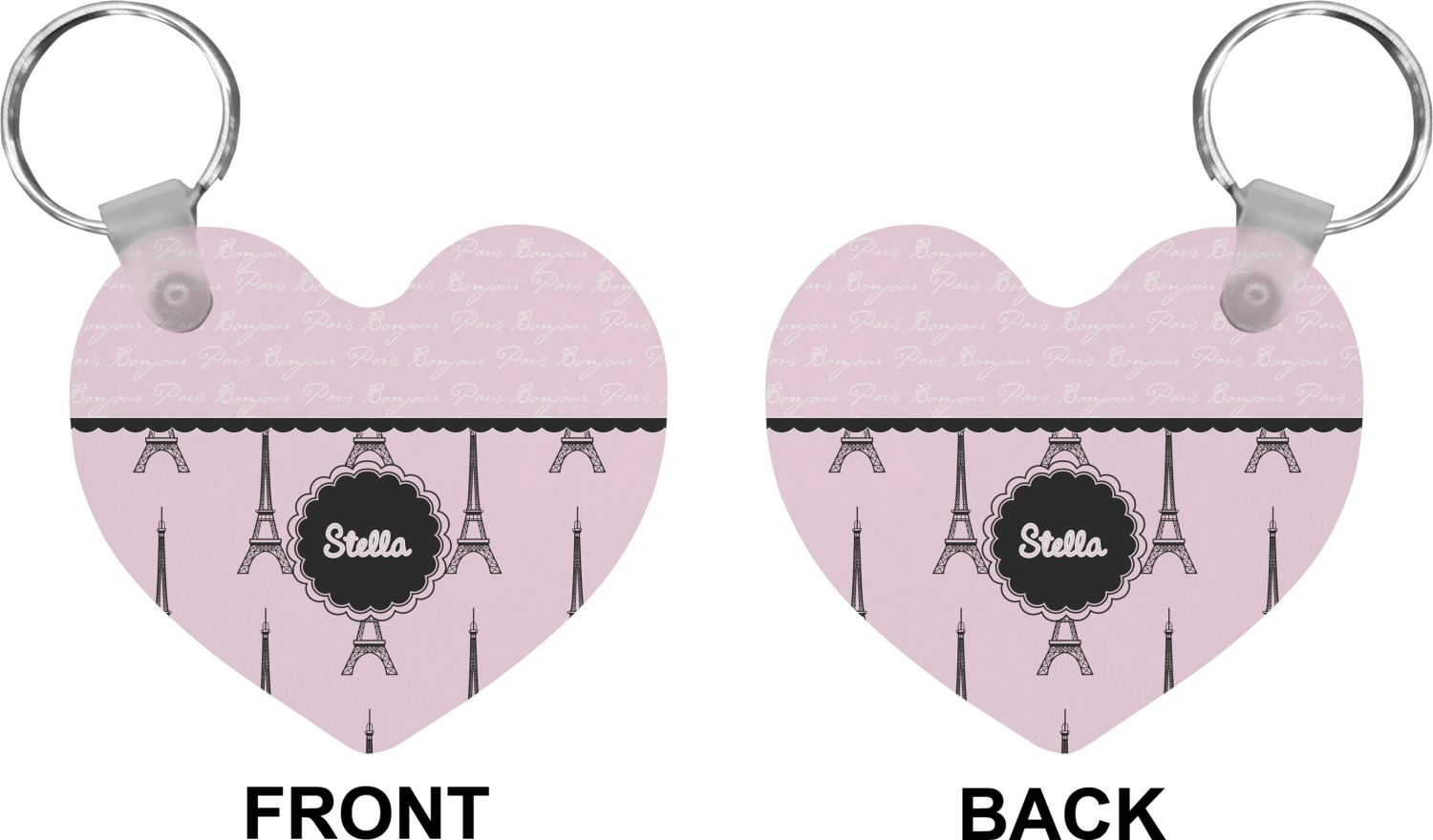 Our personalized keychains attach to the included metal, split key ring with a plastic, removable snap. Since a metal ring is included with your purchase, you have the liberty to keep your keys together on the ring, with or without your unique keychain. We offer this keychain in three different shapes: circle, heart, or diamond. We print your personalized design(s) on both sides of the key chain, and the surface has a glossy, reflective finish that only emphasizes your design. Each keychain is approximately 2.25 by 2.25 inches.