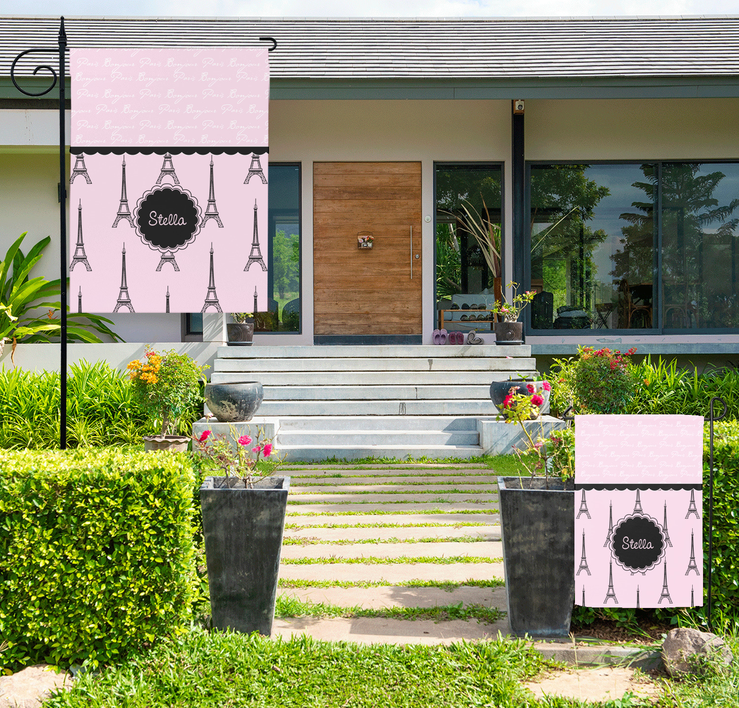 These custom garden flags are made of a durable, double-ply, polyester weave, allowing them to withstand the elements year round. The small flags measure at approximately 12 by 18 inches. The large flags measure out to 28 by 37 inches. You can order these decorative flags with your customization printed on the front only, or the front and back.