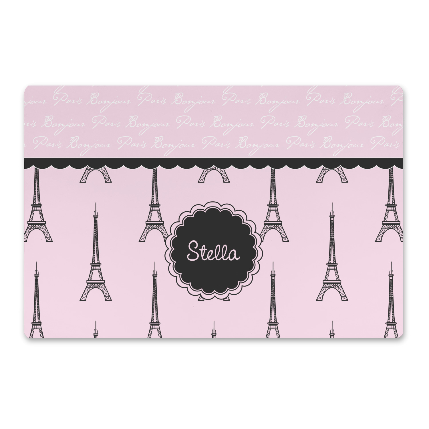 "Bonjour, Paris!" will be the first words spoken when you see this beautiful French inspired design. You will bring a bit of Parisian elegance to your decor when choosing this gorgeous French Eiffel Tower design set on a pretty pink backdrop. The beautiful black scalloped label on the whimsical pink highlights the personalization of your choice.