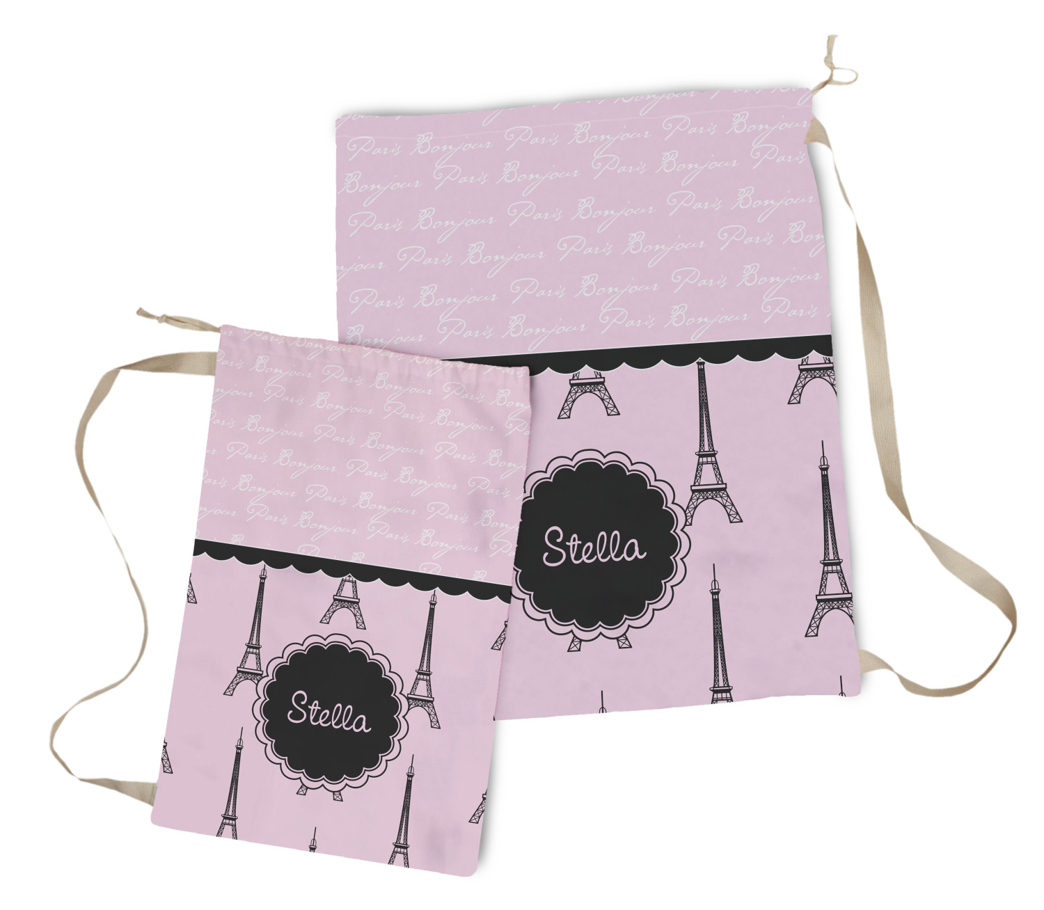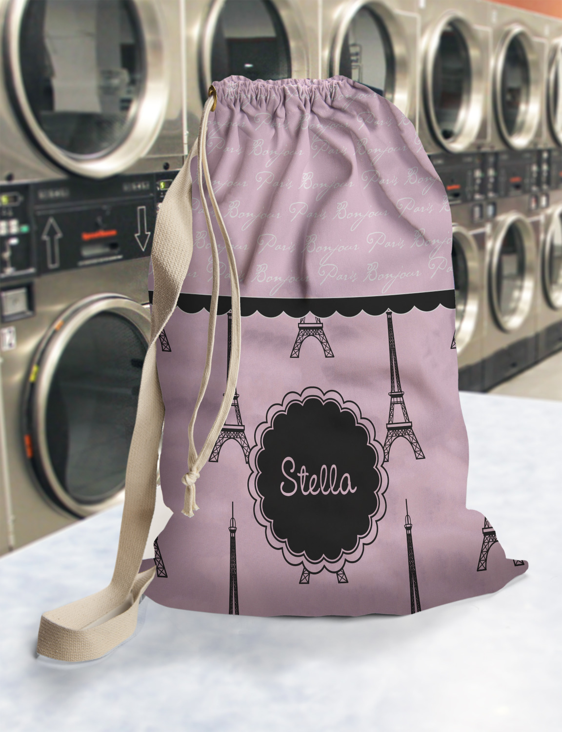 Carry your laundry in style with these customized laundry bags. Available in two sizes, featuring a natural colored woven strap and a cinch cord, these bags hold a lot of clothes or anything else you want to fit in them.