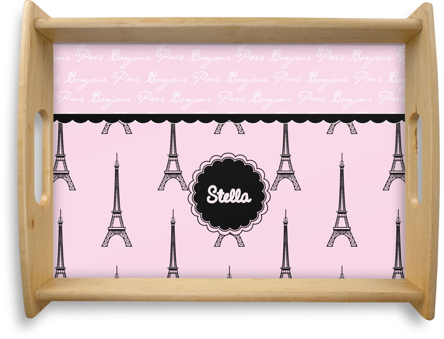 "Bonjour, Paris!" will be the first words spoken when you see this beautiful French inspired design. You will bring a bit of Parisian elegance to your decor when choosing this gorgeous French Eiffel Tower design set on a pretty pink backdrop. The beautiful black scalloped label on the whimsical pink highlights the personalization of your choice.