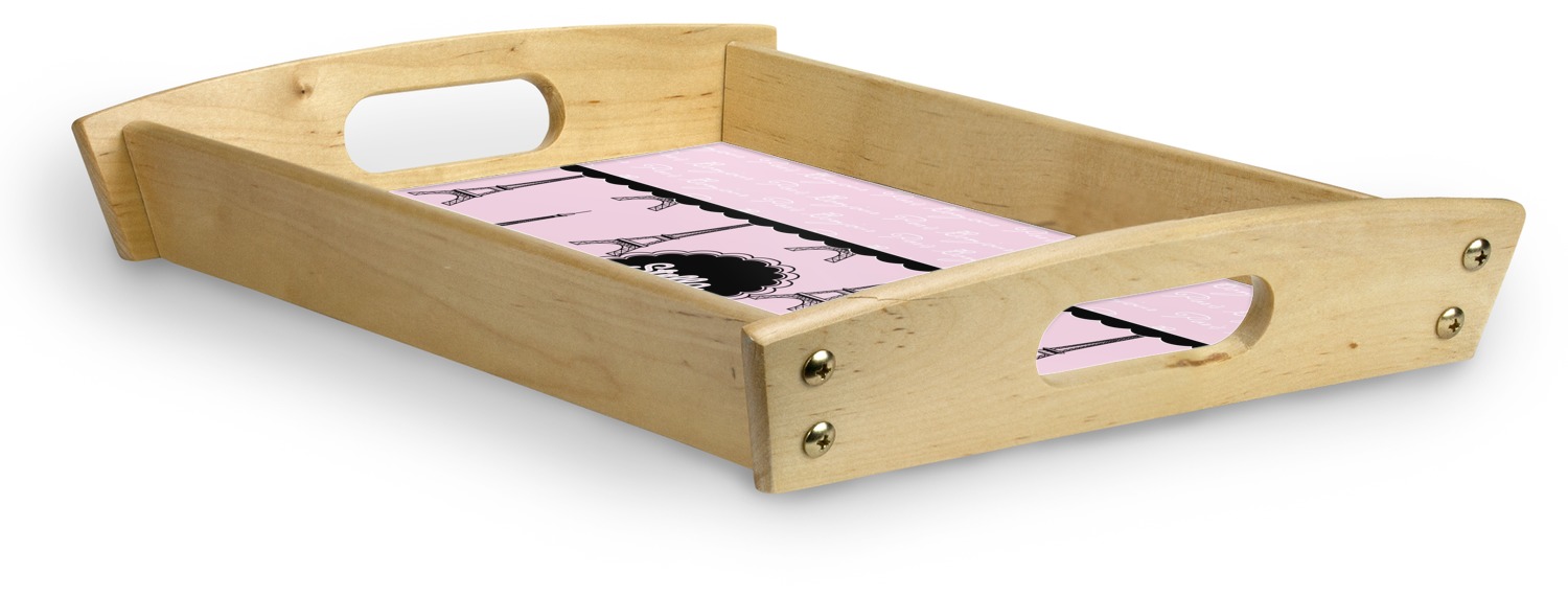This serving tray with handles features square edges and two rounded sides, creating a very modern look. Each side is fabricated from a beautifully cut, natural wood. The bottom of the interior of the tray displays your customized design in bright, vibrant color. The tray is sold in both a black color and a natural wood look. Each variation of the wood serving tray has two sizes: Small, which is 14" x 10" x 2.25", and Large, which is 19.5" x 13.5" x 2.75".