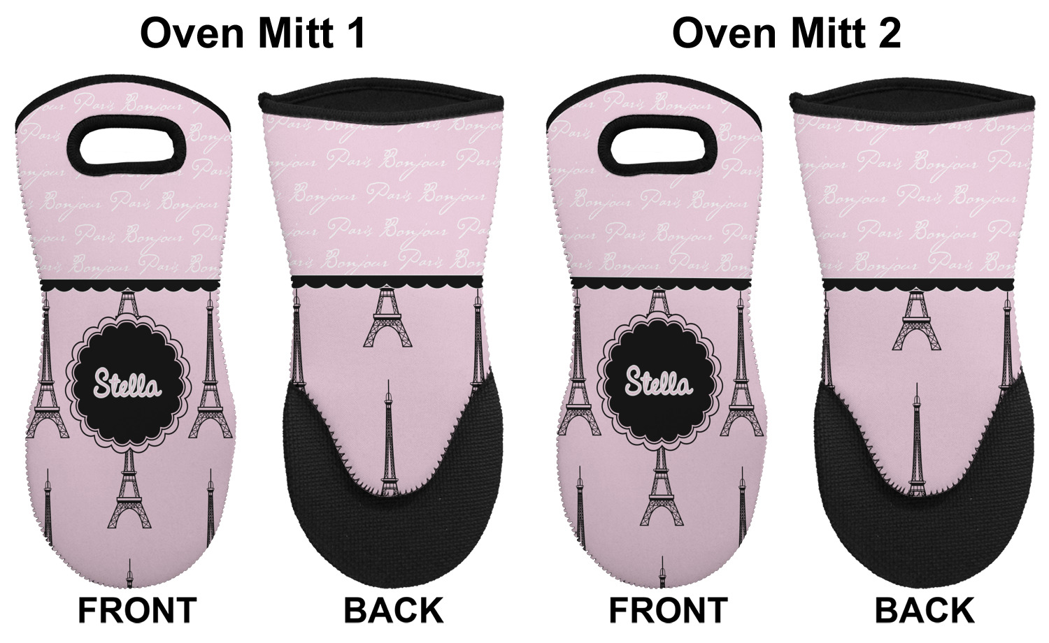 These heat resistant gloves are made entirely of a durable neoprene; the front features a softer texture, while the palm's side has a textured surface, meant to handle heat up to 500 degrees Fahrenheit. Thick, heavy duty stitching connects the two sides. A small, oval cutout appears on the front, and can be used to hang and store the mitt. Your personalization appears on the front, and the upper part of the back of the mitt. The style of these oven mitts are suitable for both the right and left hand, depending on your needs. If you need one for each hand, be sure to order two!