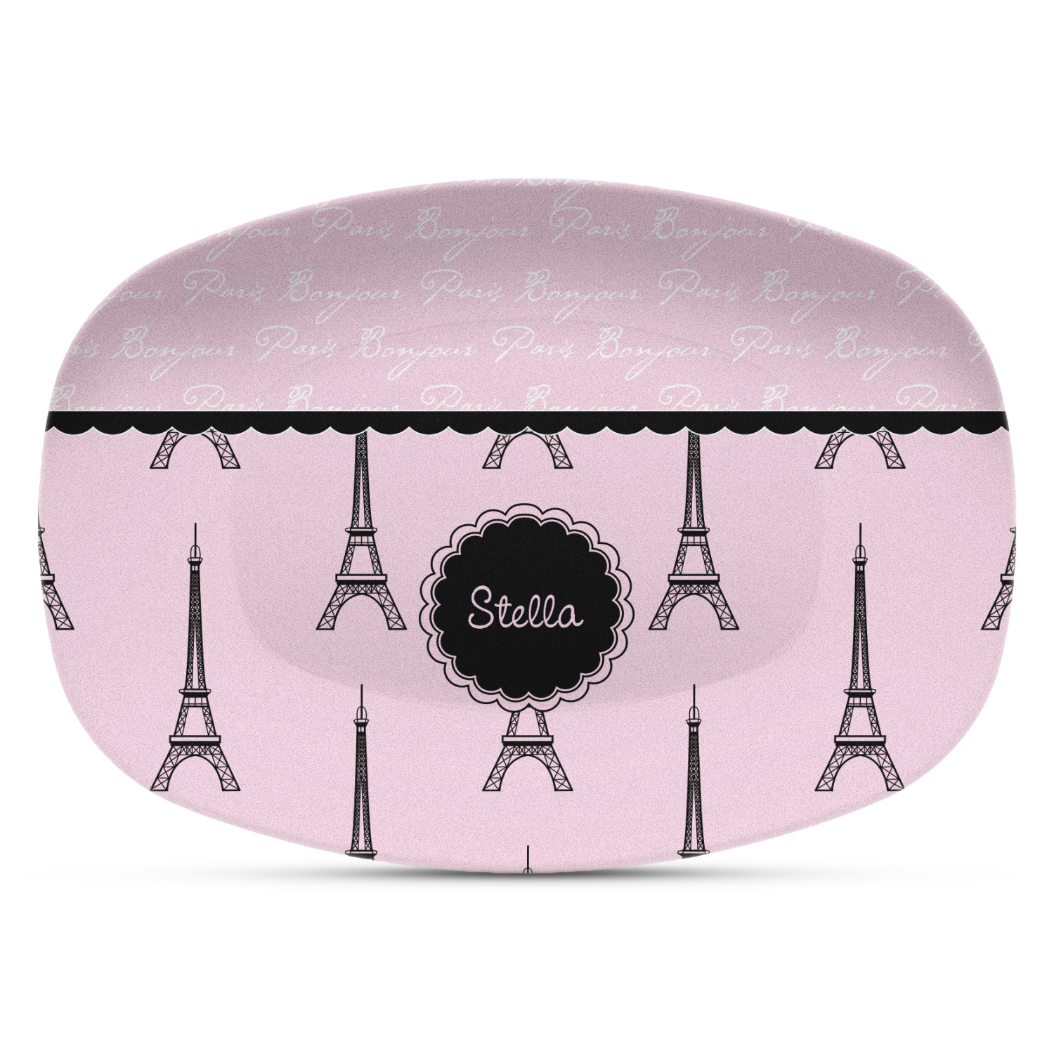 "Bonjour, Paris!" will be the first words spoken when you see this beautiful French inspired design. You will bring a bit of Parisian elegance to your decor when choosing this gorgeous French Eiffel Tower design set on a pretty pink backdrop. The beautiful black scalloped label on the whimsical pink highlights the personalization of your choice.