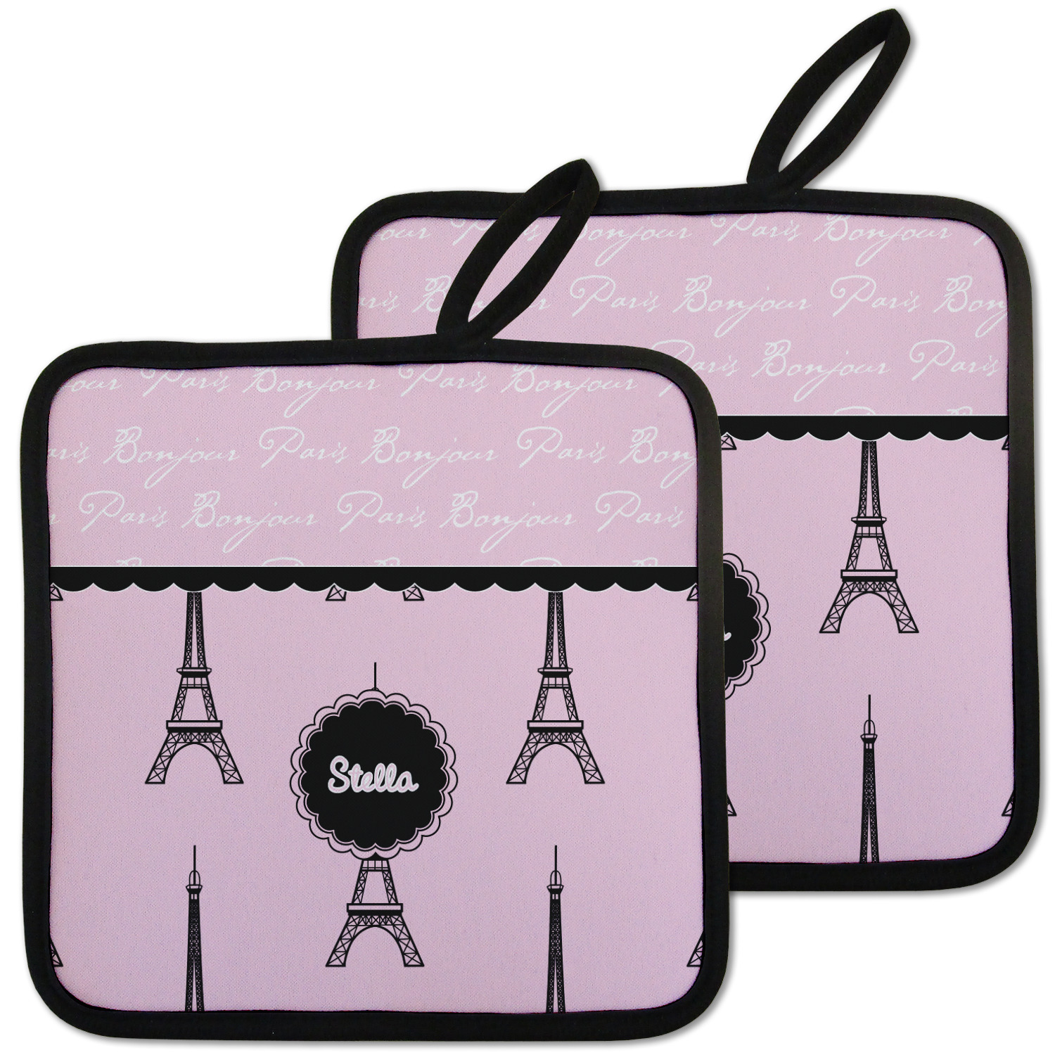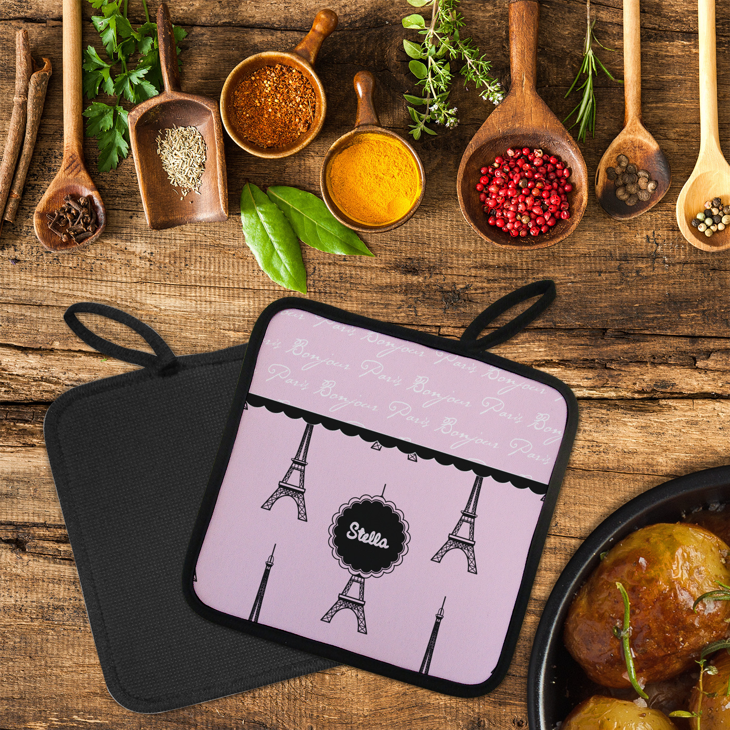 Our personalized pot holders feature a neoprene front that displays your personalization in vibrant colors. The backing of the hot pot holder is rubberized; the textured backing allows you to have a great grip when using this custom pot holder. The two materials are joined with a sleek, black trim, and the holder also includes an attached loop for hanging and storage. The pot holder is approximately 8.75 inches by 8.75 inches and 0.25 inches tall, while the fabric loop is 2.5 inches long. You can purchase a kitchen pot holder by itself or as a set of 2. We also offer a set including one pot holder and one oven mitt.