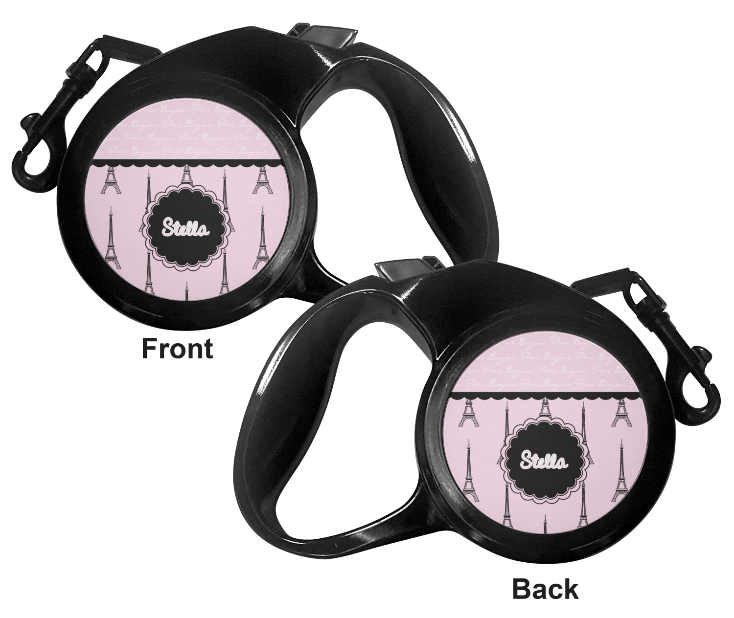 The leash's plastic handle is accommodating of your grip and displays your customization on both sides. The dog leash also features the traditional bolt snap clip, for easy fastening to your dog's collar. The leash and leash handle themselves are both black in color.