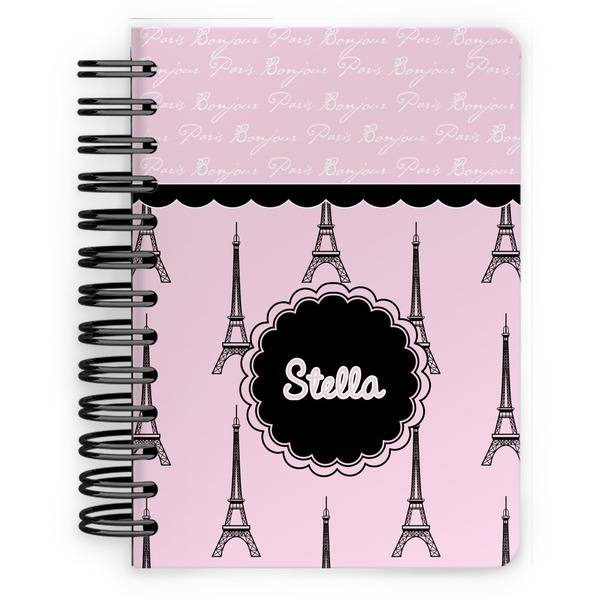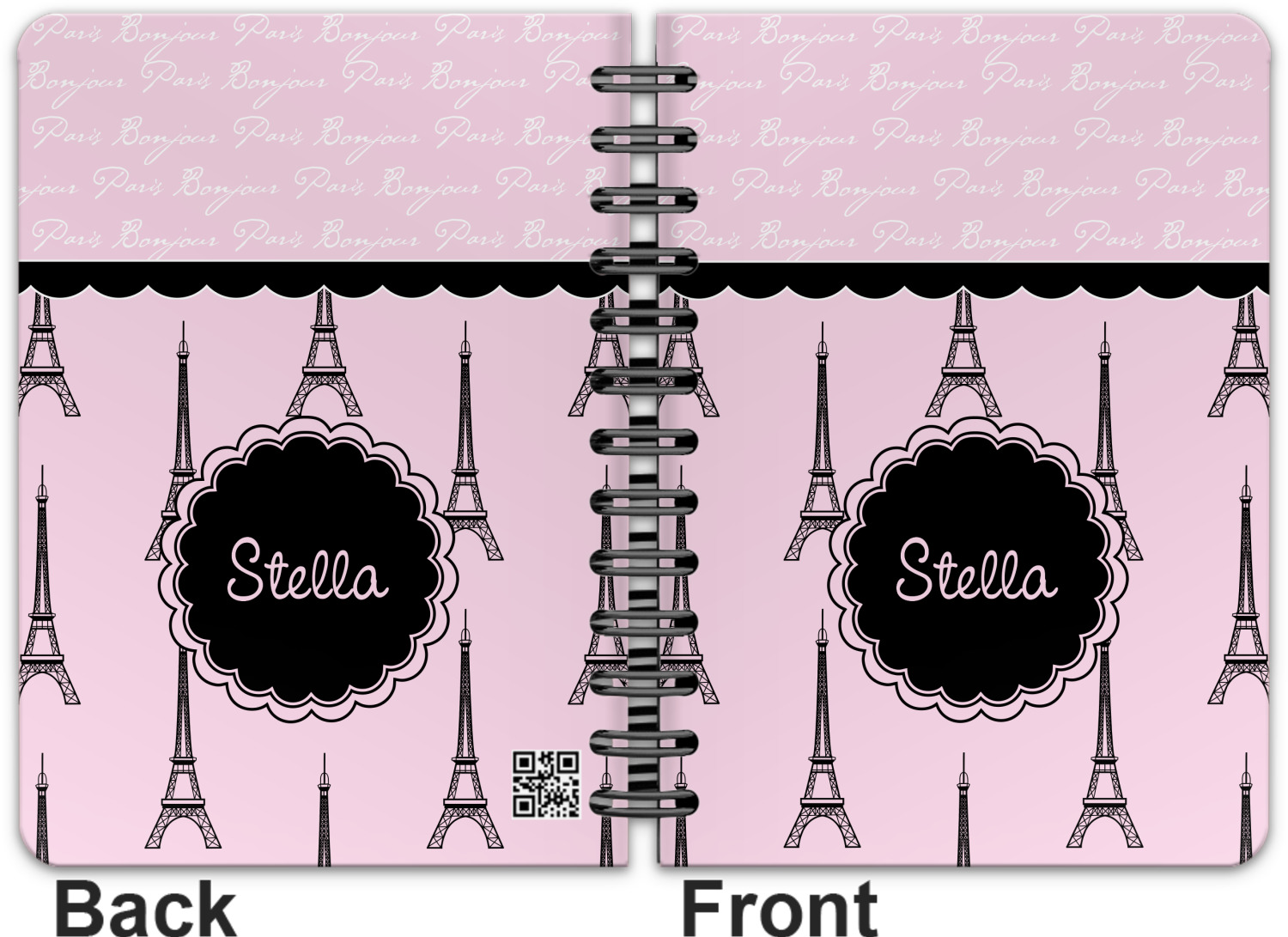 This spiral notebook includes 75 sheets of thick, ruled paper. The front and back of this custom notebook is made of a robust, laminate, plastic covering. We print your personalization on these two panels, underneath a glossy finish, which emphasizes the colors of your design. The two panels and the sheets of paper are held together by a sturdy, black coil. The paper within your bound notebook is perforated for easy, clean tearing.