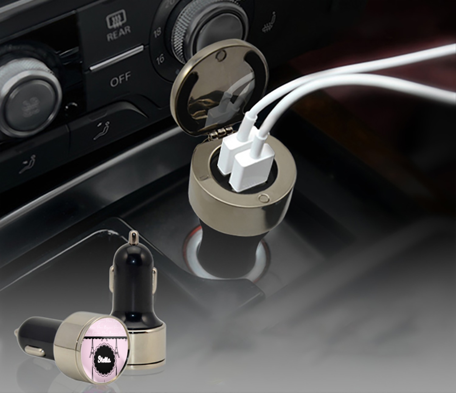 This car charger adapter converts your cars bland cigarette lighter into a decorative, personalized, and operational USB charging port. Made of solid, silver-plated metal, these chargers feature a flip-open lid that both displays your customized design and conceals two USB ports. The metal lid of the USB car charger adapter is 1.5" in diameter and seals due to a small, ingrained magnet on both the charger and its lid. The cigarette lighter insert, itself, is colored black.