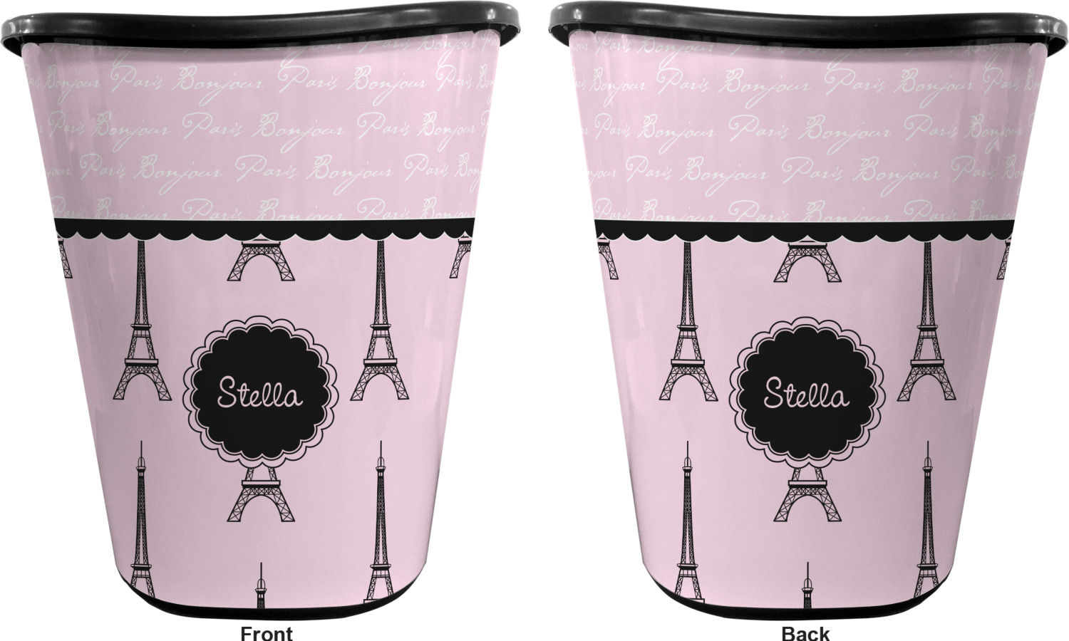 You can choose to purchase these decorative wastebaskets in either a white or a black color that will show on the base and the upper rim. Your customization is printed on a high-gloss, fine-quality vinyl adhesive, and you can choose to either have this adhesive applied to one side only or to both sides. As such, this plastic wastebasket can be single-sided or double-sided, depending on your creative vision. Your customization is printed using durable inks, making the design waterproof and resistant to fading over time.
