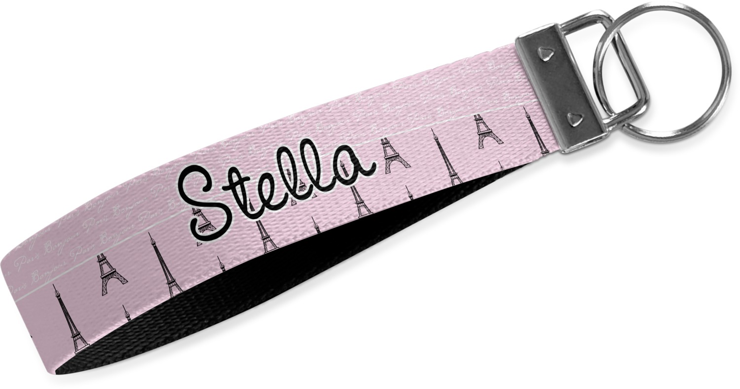 These key fob keychains are made from a polyester weave, right here in the USA. They feature a silver, metal clasp, attached to a round keyring. The piece gives the personalized wristlet a beautiful, finished look. Your customized design is printed on the outside of the keychain strap. We carry these wristlets in two sizes: small, which is 5 inches in width, and large, which is 5.5 inches in width.