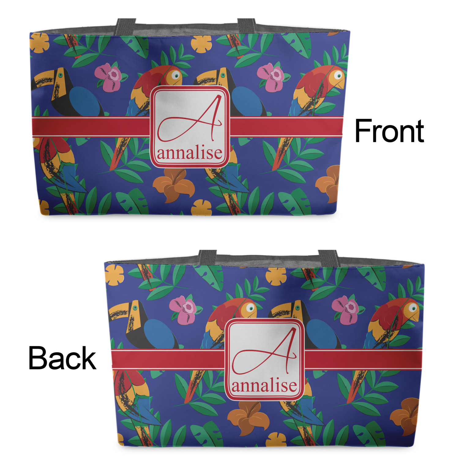 These beach totes are handmade here in the USA. Fabric is printed with your design. The tote is then sewn from the fabric pieces, lining and handles added.