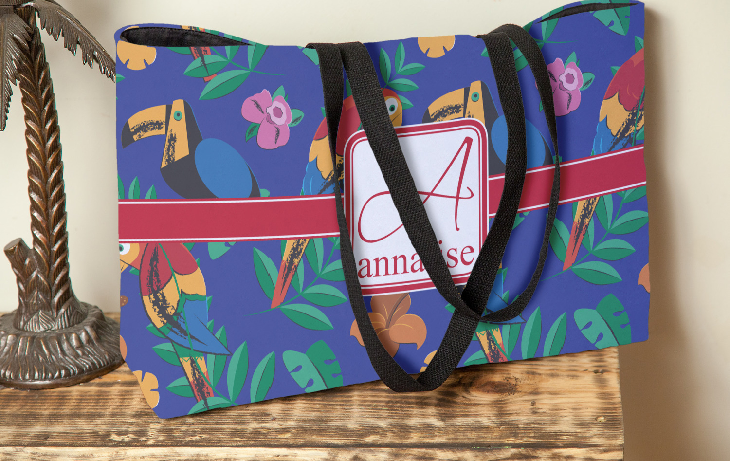The totes are made from a sturdy canvas material on the outside and are lined with a black poly cotton lining. The beach totes have an approx. 28" black woven handles.