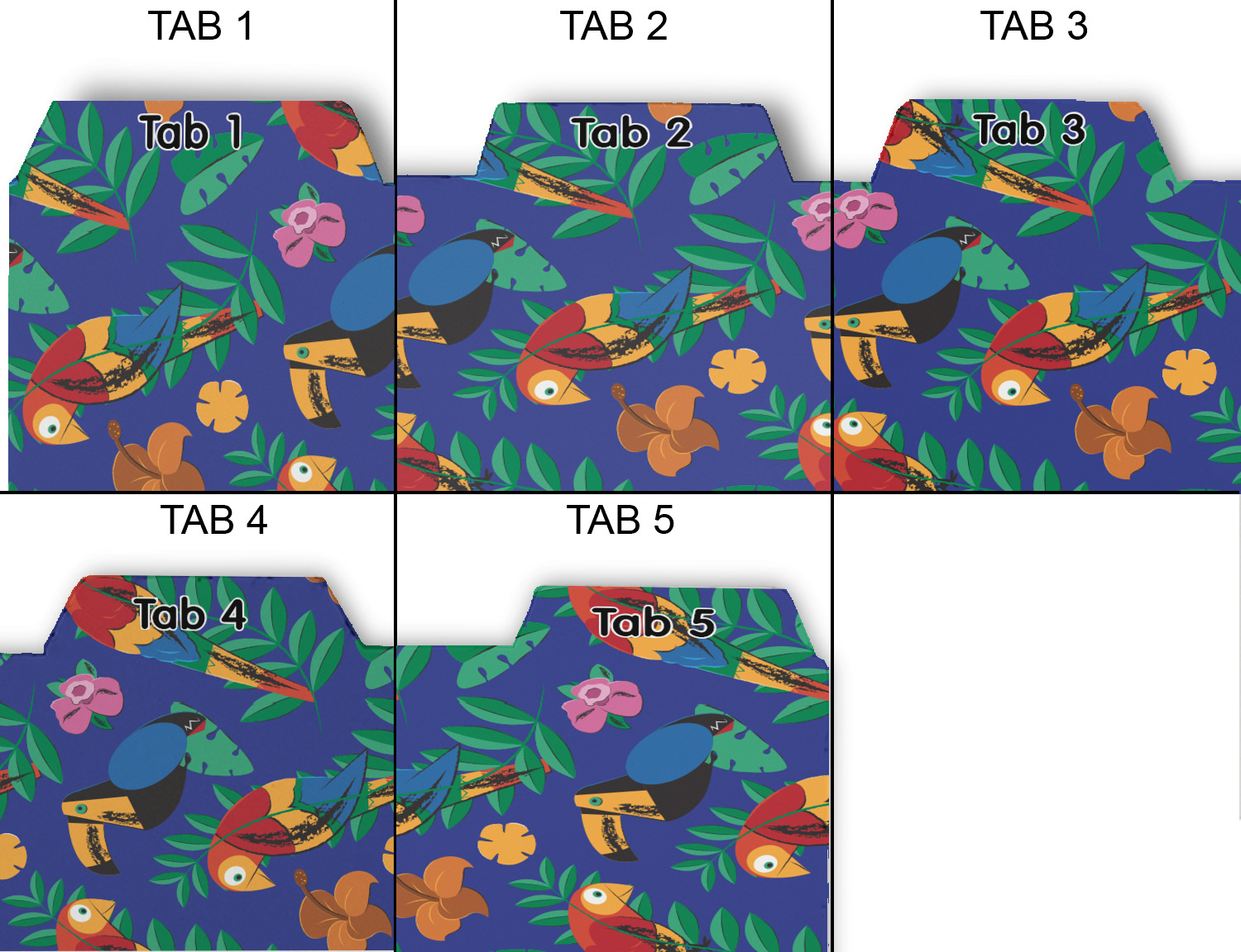 Whether you use binders at school or at work, we have designs to suit all of them. Available in 5 or 6 tab sets, you are sure to find a set to suit your needs. The back of each one is white and can be used to take notes, write vital information on, etc.