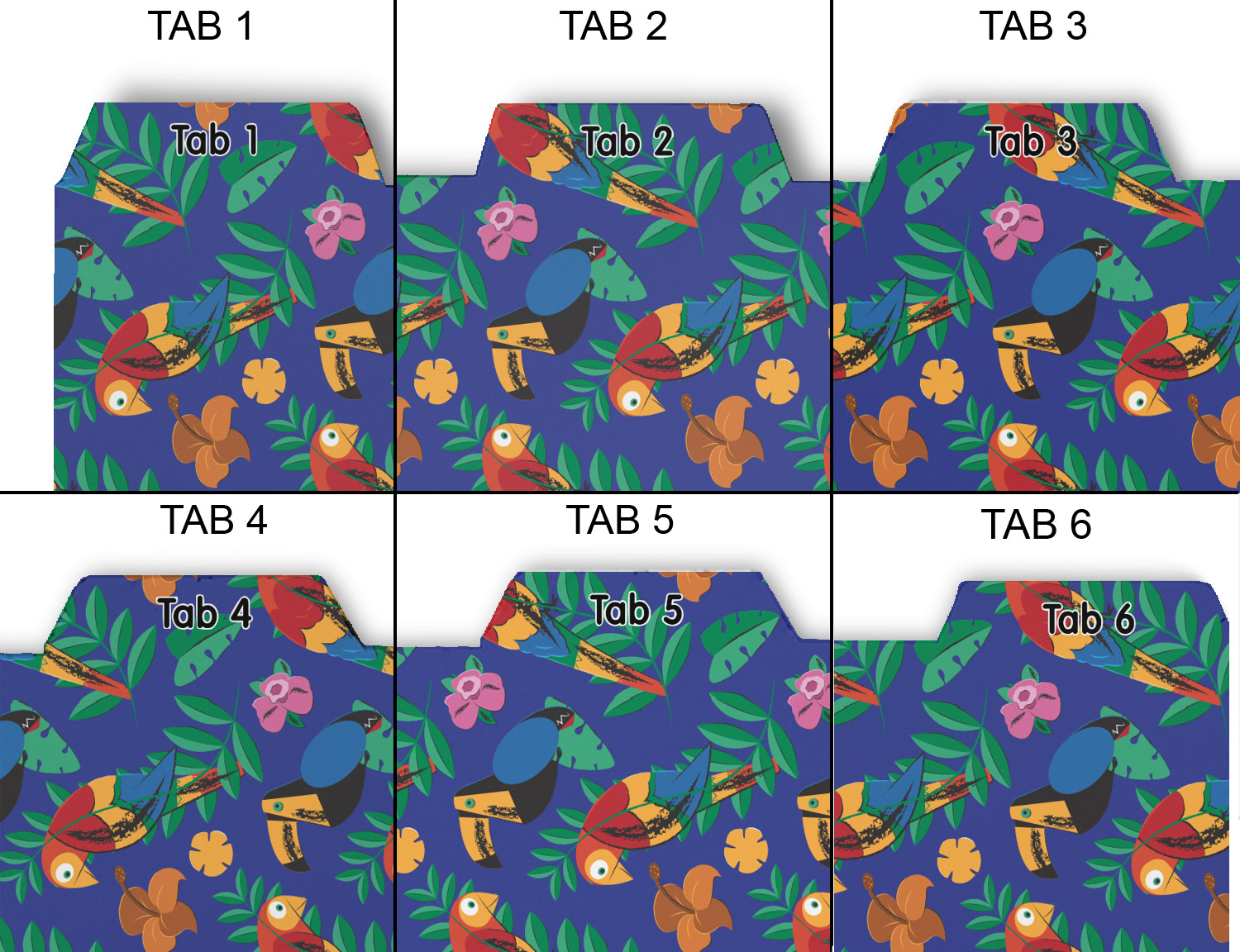 Whether you use binders at school or at work, we have designs to suit all of them. Available in 5 or 6 tab sets, you are sure to find a set to suit your needs. The back of each one is white and can be used to take notes, write vital information on, etc.