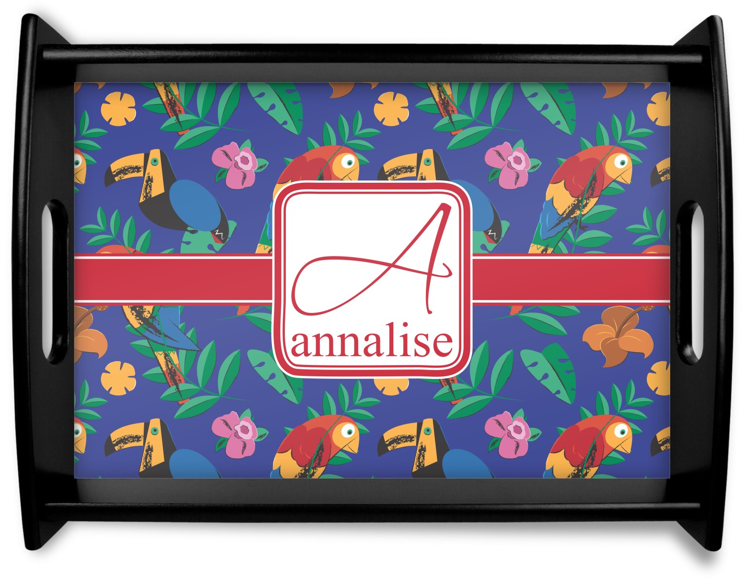 This serving tray with handles features square edges and two rounded sides, creating a very modern look. Each side is fabricated from a beautifully cut, natural wood. The bottom of the interior of the tray displays your customized design in bright, vibrant color. The tray is sold in both a black color and a natural wood look. Each variation of the wood serving tray has two sizes: Small, which is 14" x 10" x 2.25", and Large, which is 19.5" x 13.5" x 2.75".