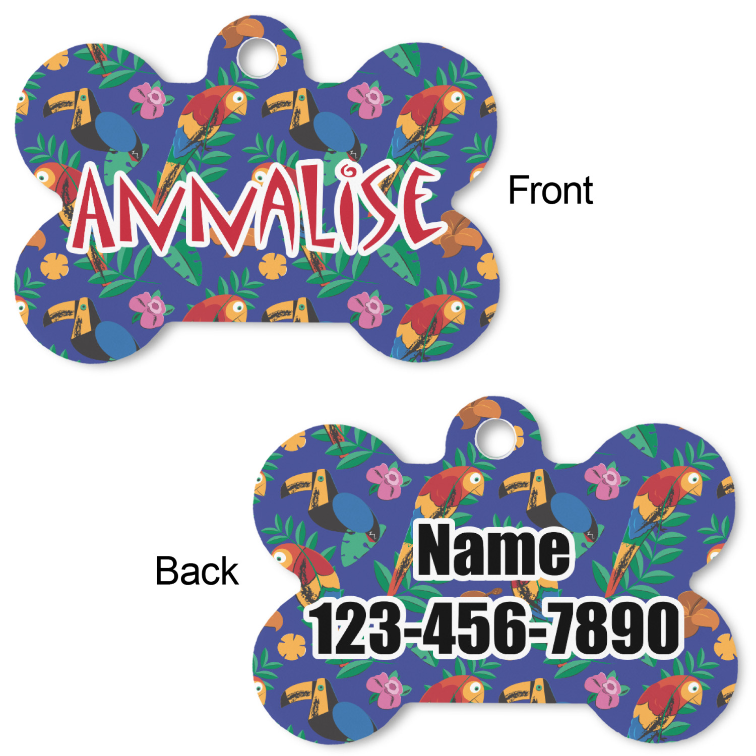 Our default design templates print your dog's personalization on the front and your contact information on the back; however everything is customizable, so you customize the patterns, the colors, the personalization, the contact information etc.