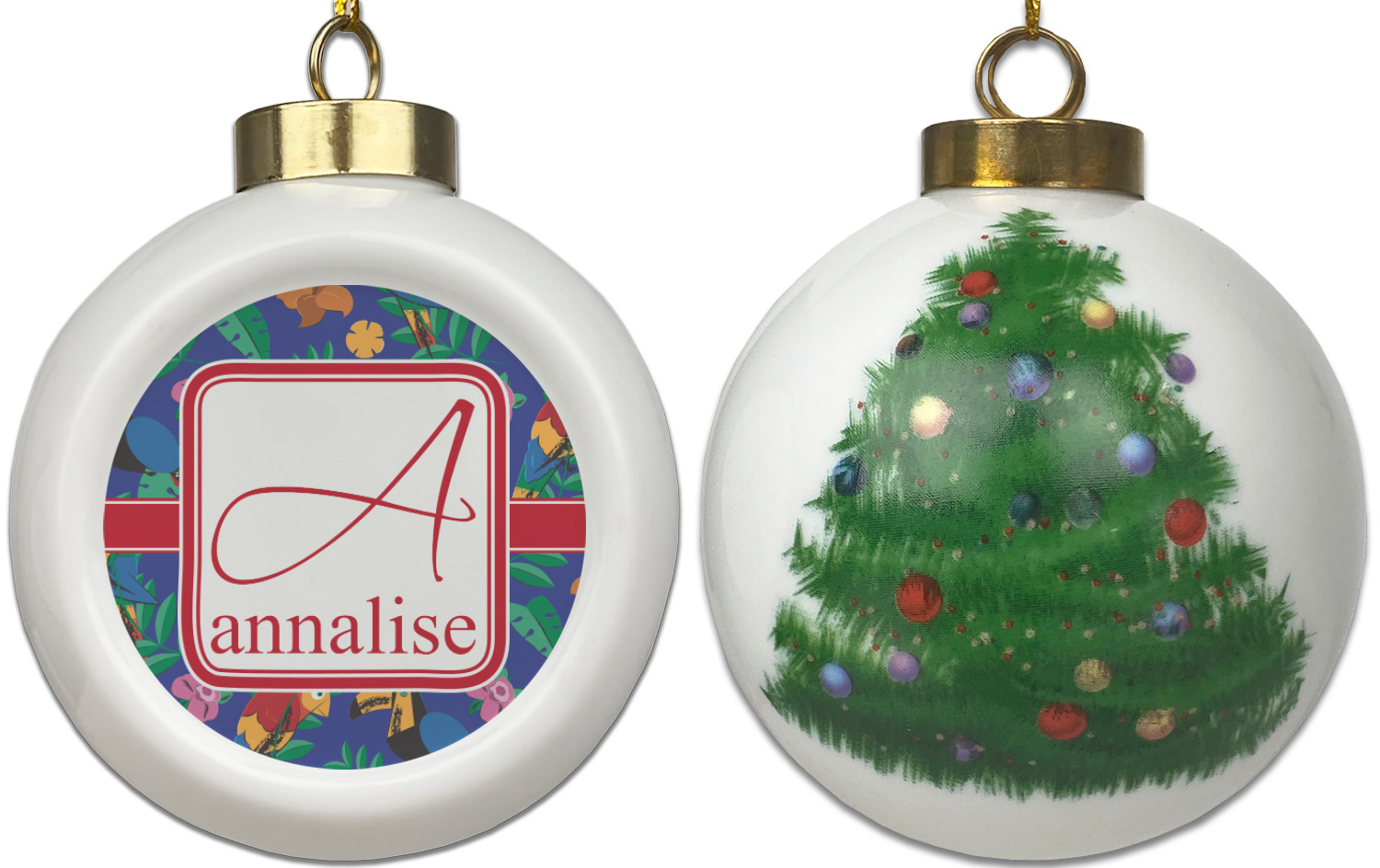 Our Christmas ornaments are a unique ceramic ball shape with a twist as it has a flat face to display your custom design! Select from one of our two design types - Christmas Tree or Poinsettia Garland - to adorn the curved back of your personal design. Each ornament measures 3H x 2.5W x 2D accompanied with a gold string accent for finishing touches to hang on your beautiful Christmas tree!
