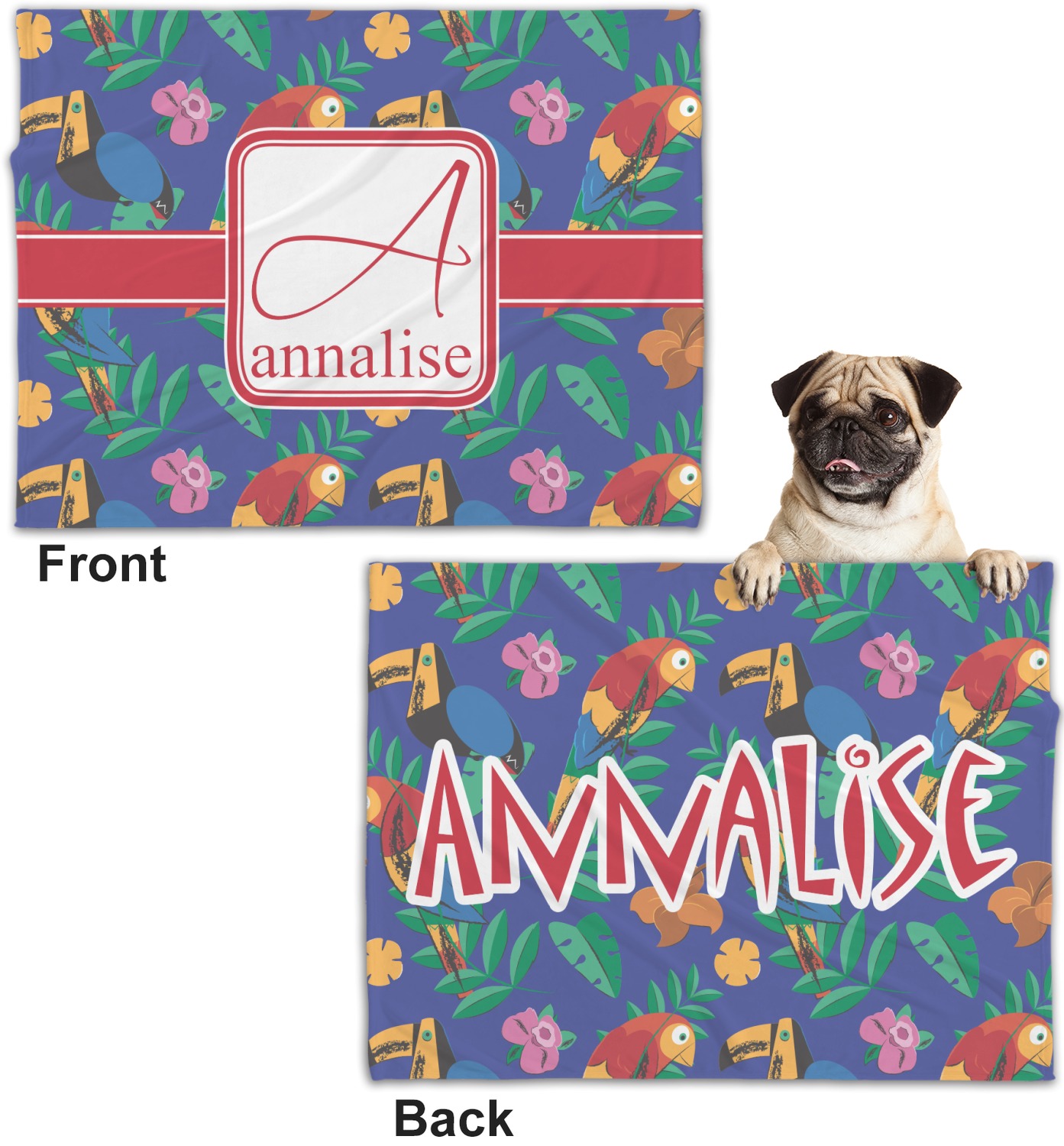 These dog blankets are crafted from a gentle, soft-to-the-touch, minky material. We print your customizations, either matching or differing, on both the top and underside of the blanket. These personalized dog blankets are available in two sizes: regular and large. Our regular size, at 40" x 30", accommodates small and some medium size dogs. At 60" x 50", our large dog blanket is a better fit for bigger breeds. Though specialized for dogs, these blankets still make a thoughtful gift for your favorite feline, or any other pet in mind!