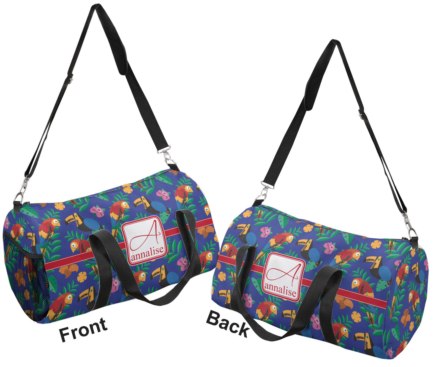 This duffle is a sturdy bag made of a canvas material. It comes in two sizes: Small (19"W x 9.5"H x 9.5"D) and Large (23"W x 12"H x 12"D). The bag is a cylindrical shape with a black adjustable strap and two handles. On one side is an elastic pouch to put a waterbottle or other small item. Your product will be sublimated with your design and is able to be designed on the front, back, and sides. Be sure to remember that the straps may cut into parts of your design if you upload your own artwork.