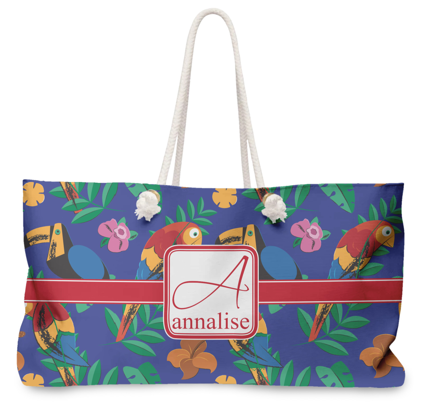 Our oversized weekender tote with rope handles is perfect for your weekend at the beach or on the town. This large tote are 24" W X 13" H, with a 5" gusset and a 27" thick rope handles with a knot that is put through a grommeted brass hole.