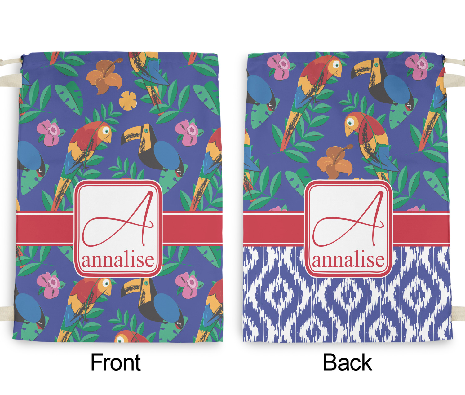 Carry your laundry in style with these customized laundry bags. Available in two sizes, featuring a natural colored woven strap and a cinch cord, these bags hold a lot of clothes or anything else you want to fit in them.