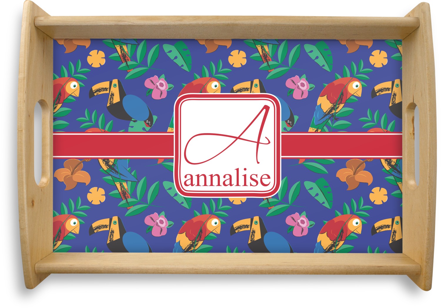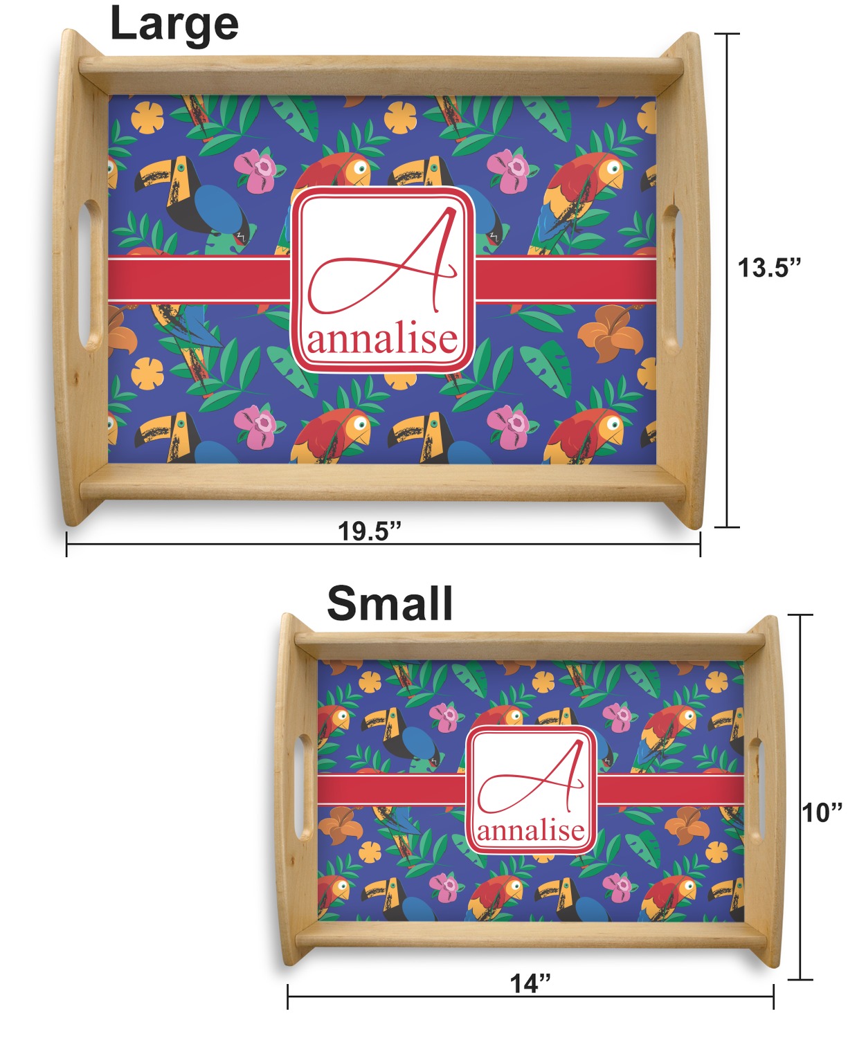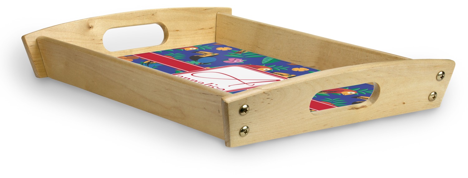 This serving tray with handles features square edges and two rounded sides, creating a very modern look. Each side is fabricated from a beautifully cut, natural wood. The bottom of the interior of the tray displays your customized design in bright, vibrant color. The tray is sold in both a black color and a natural wood look. Each variation of the wood serving tray has two sizes: Small, which is 14" x 10" x 2.25", and Large, which is 19.5" x 13.5" x 2.75".
