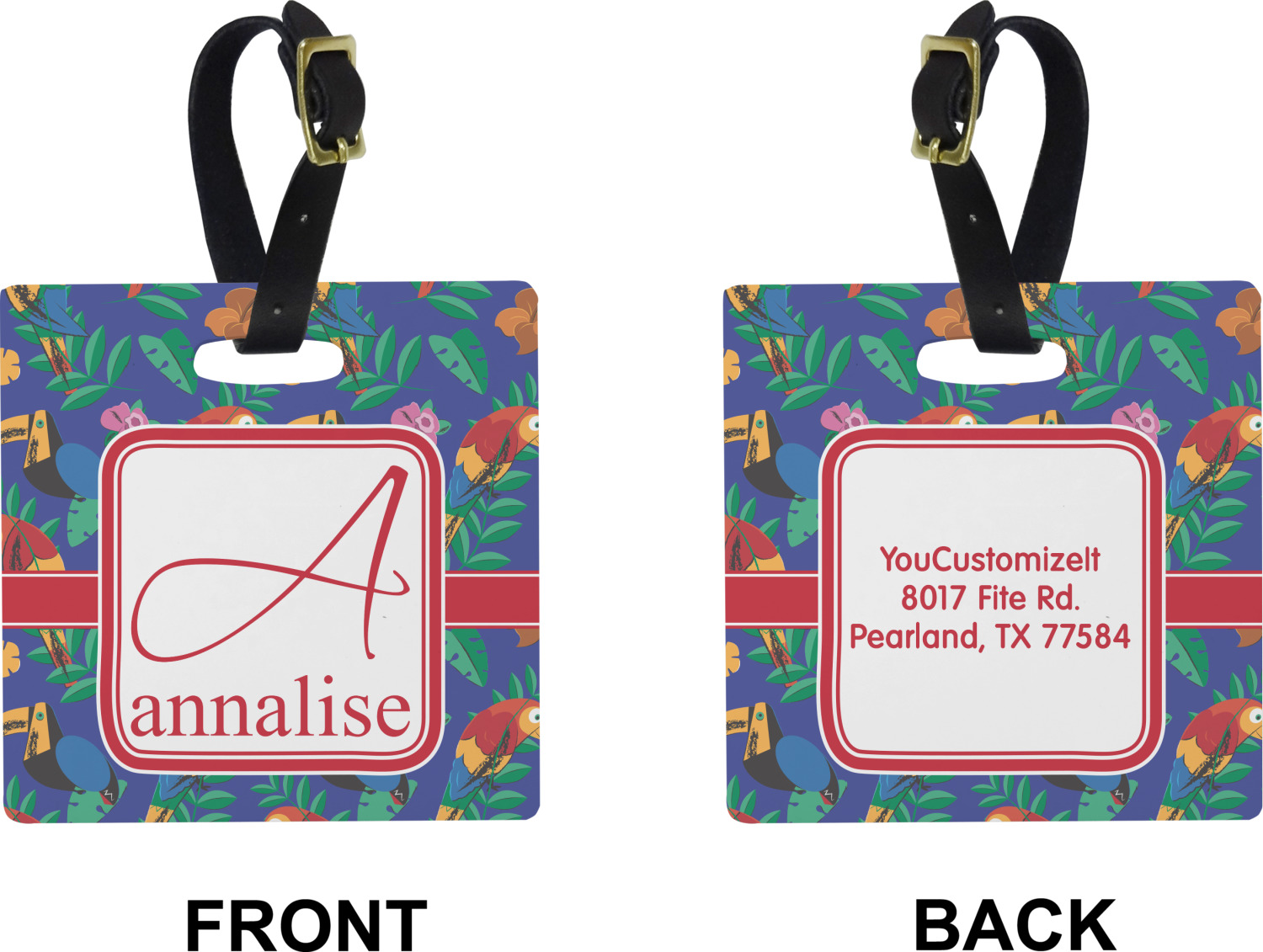 These personalized bag tags are sold in a variety of shapes, so that you may find the product that meets your vision exactly. We sell a round luggage tag, which measures at approximately 4" x 4". Our square luggage tag is about 3.5" x 3.5", while our rectangular version is 2.75" x 4 ".