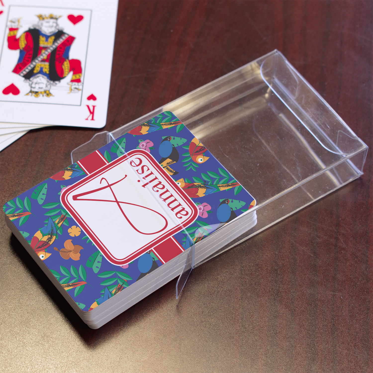 The customization / personalization is printed on the back side. The playing cards have a low gloss coating on both sides. The cards are packaged in a clear plastic box.