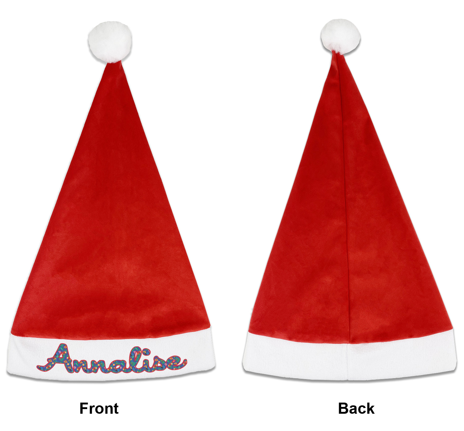 Our Santa hats are a soft, velvety polyester material. These customizable Santa hats are a classic red with white brimming and pom pom ball hanging off the hat tail just like Santa Claus! Each personalized Santa hat is approximately 17.5 L x 11.8 W. We offer two different styles to print your designs on the white brim - front or front & back.