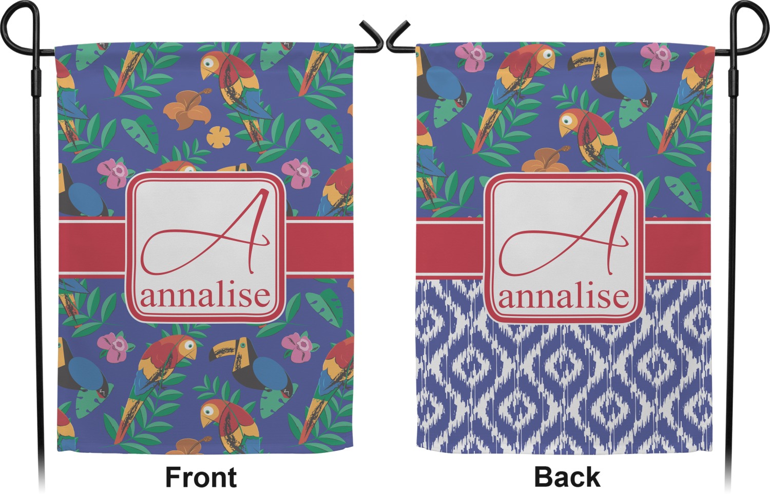 These custom garden flags are made of a durable, double-ply, polyester weave, allowing them to withstand the elements year round. The small flags measure at approximately 12 by 18 inches. The large flags measure out to 28 by 37 inches. You can order these decorative flags with your customization printed on the front only, or the front and back.
