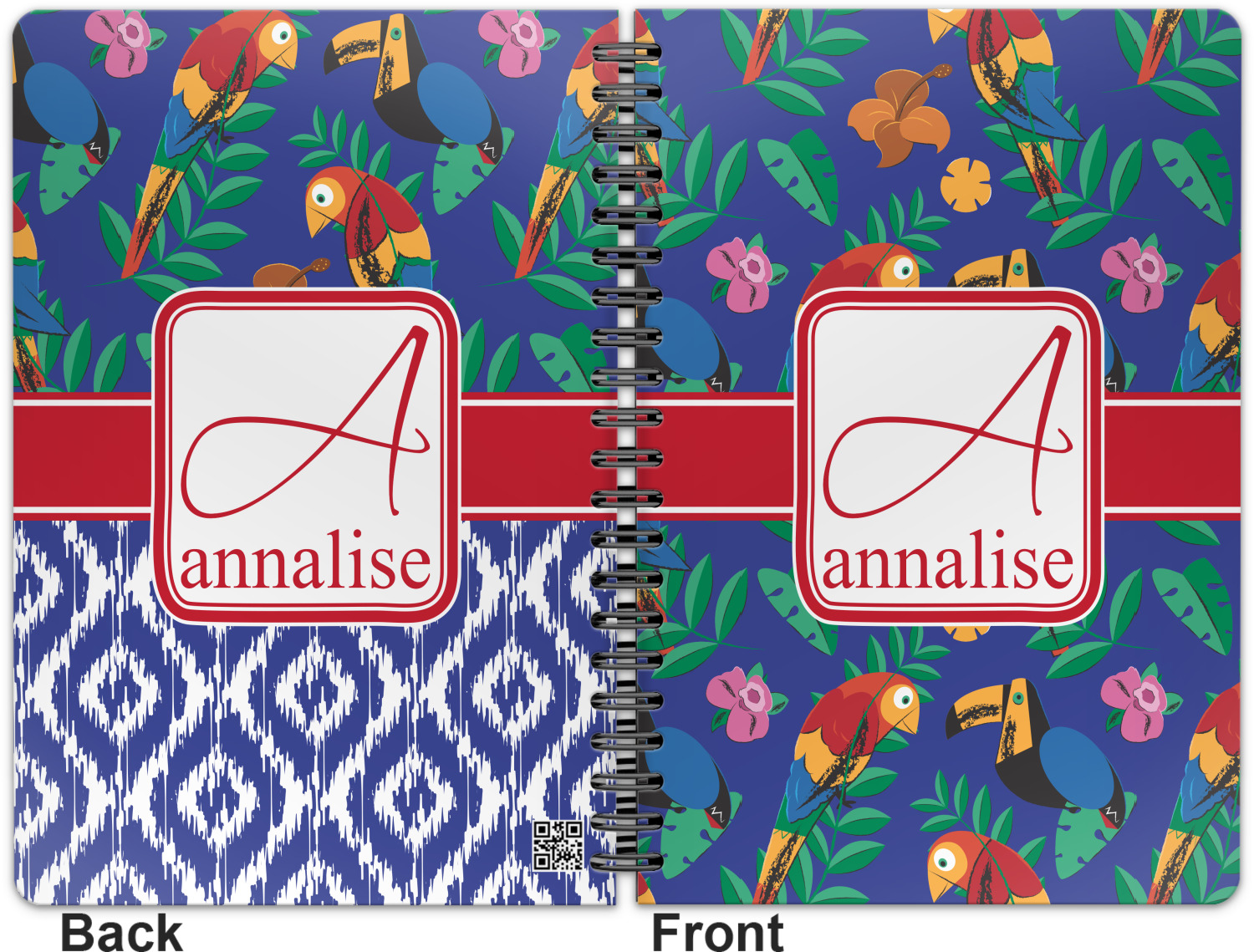 This spiral notebook includes 75 sheets of thick, ruled paper. The front and back of this custom notebook is made of a robust, laminate, plastic covering. We print your personalization on these two panels, underneath a glossy finish, which emphasizes the colors of your design. The two panels and the sheets of paper are held together by a sturdy, black coil. The paper within your bound notebook is perforated for easy, clean tearing.