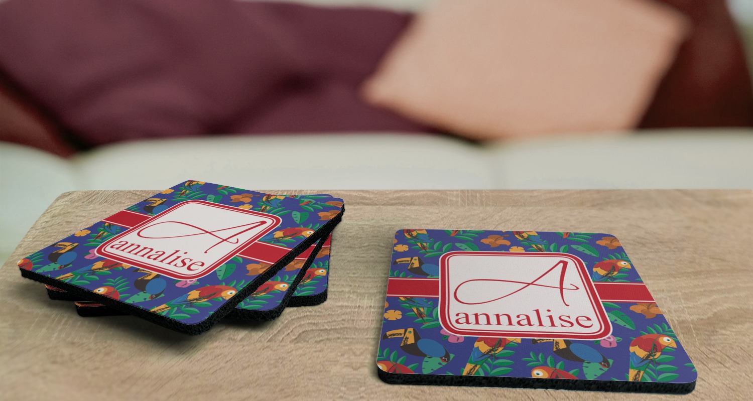 Replace your boring, run-of-the-mill coasters with a set of 4 personalized coasters! When personalized, these coasters will protect your beloved surfaces while adding to your home's decor! Thanks to your coasters bright colors and unique design, your guests will be eager to use them!