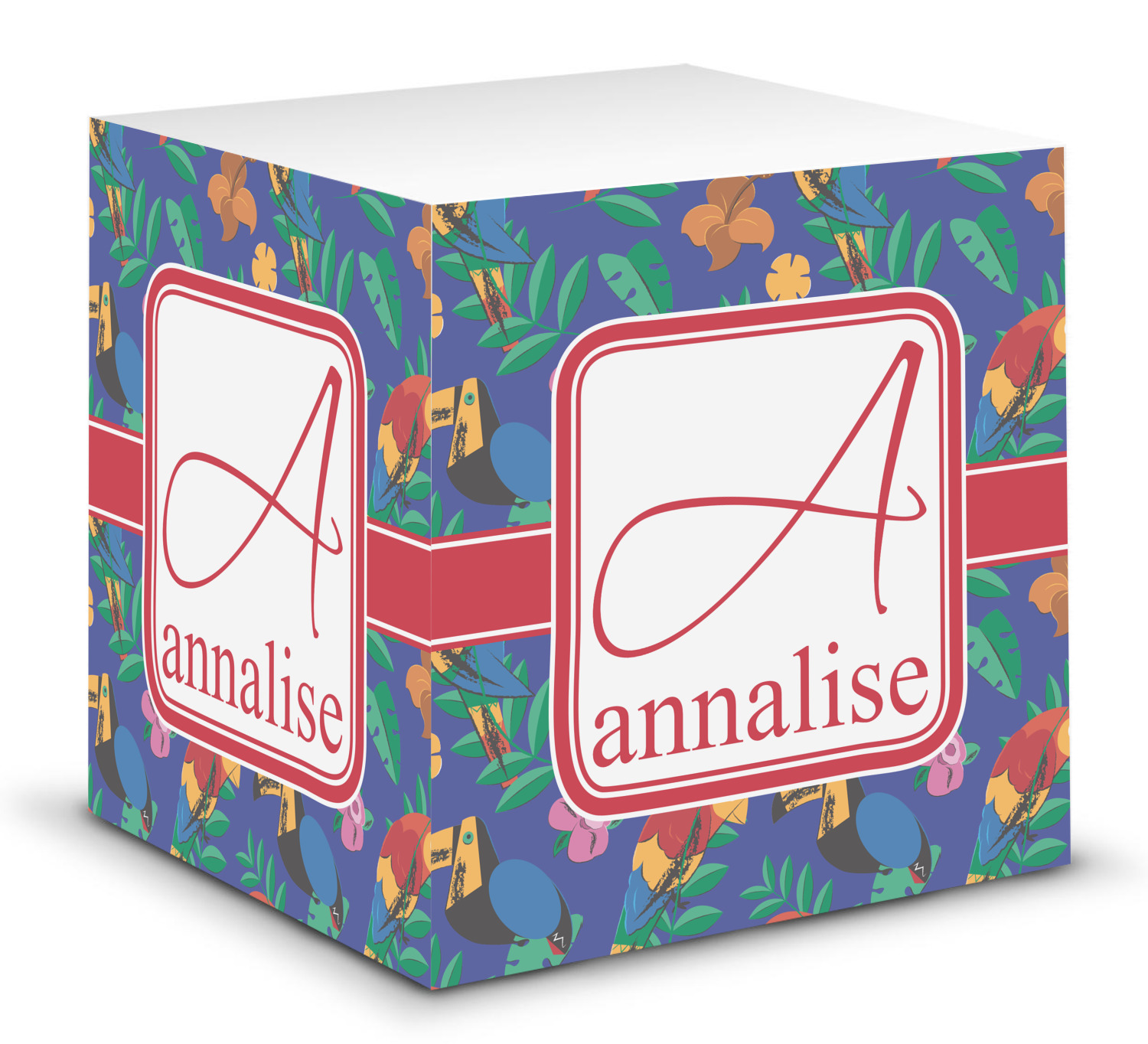 This note cube features 700 sheets of matte, white paper. Each sheet measures at 3.5 by 3.5 inches and has an adhesive strip at its top. Your personalized design is displayed on all four edges of the sticky pad.