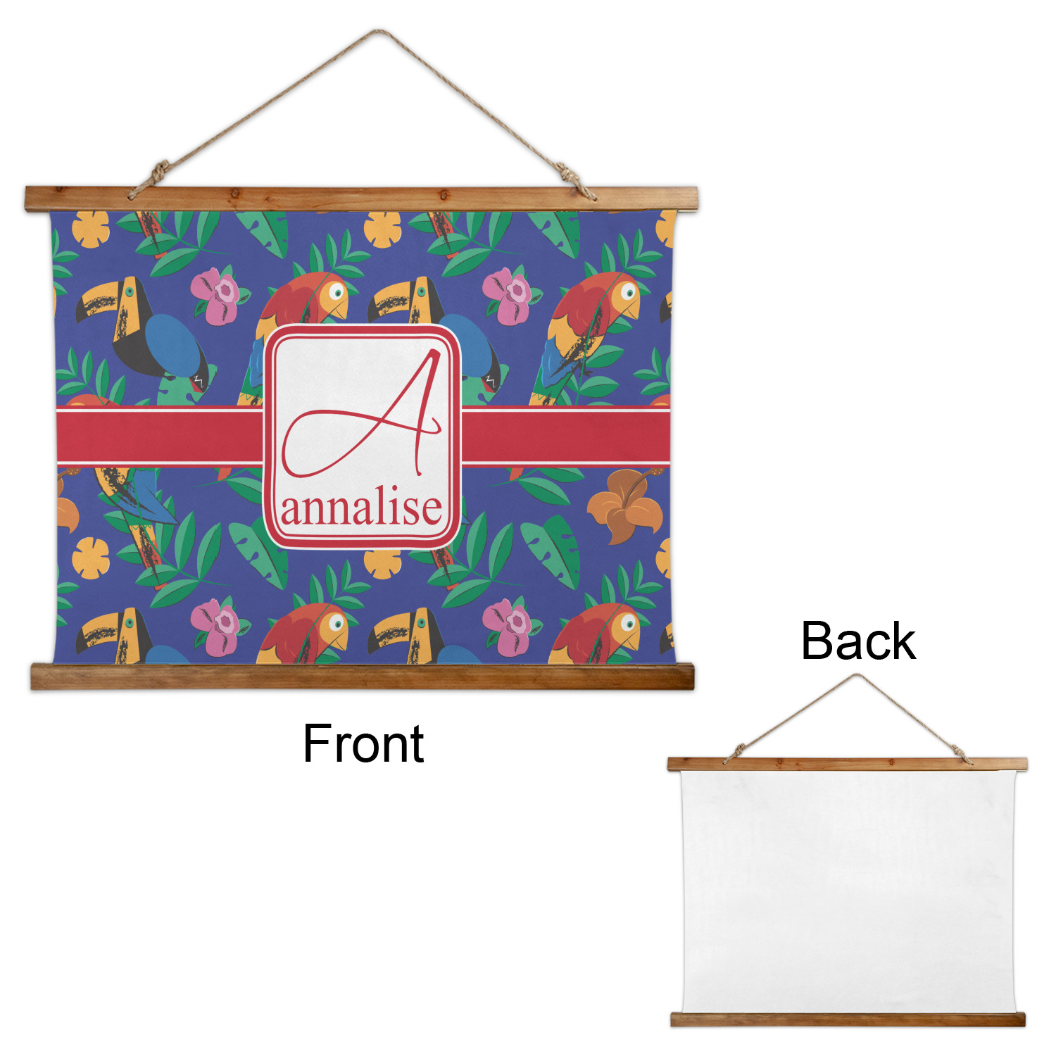 Made in two different orientations - portrait or landscape - both are 26" x 36". Your design is printed on a high quality polyester fabric with hemmed edges. The wood on the top and bottom of the tapestry is 1.25" tall and 0.25" thick and there are two pieces on top and bottom which sandwich the fabric.