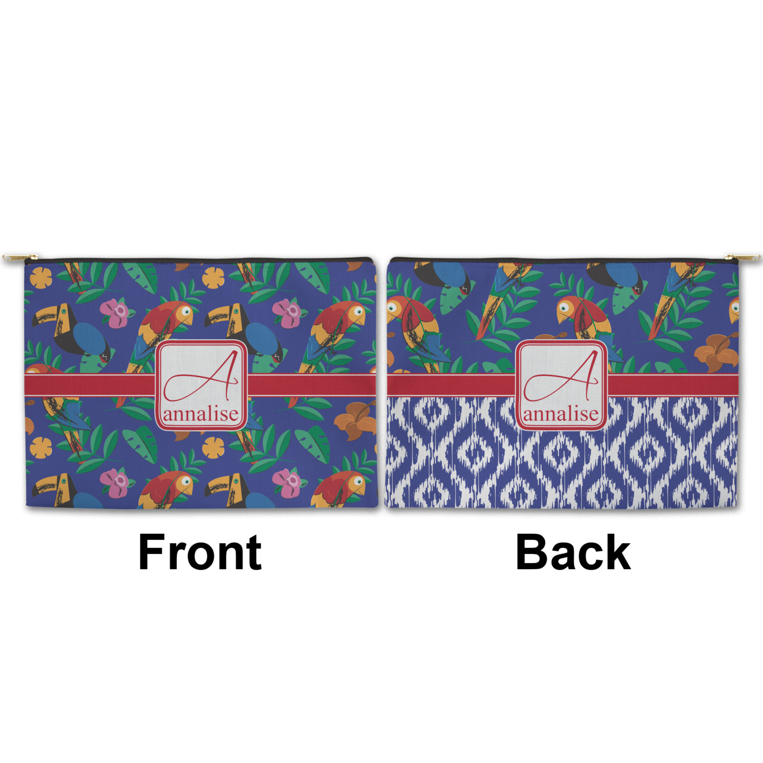 You can design both the front and the back of the pouch - same design, two complementary designs or two totally different designs - the choice is yours! We offer many different personalization styles i.e. name, name & initial, monograms - so the choice to personalize is also yours.