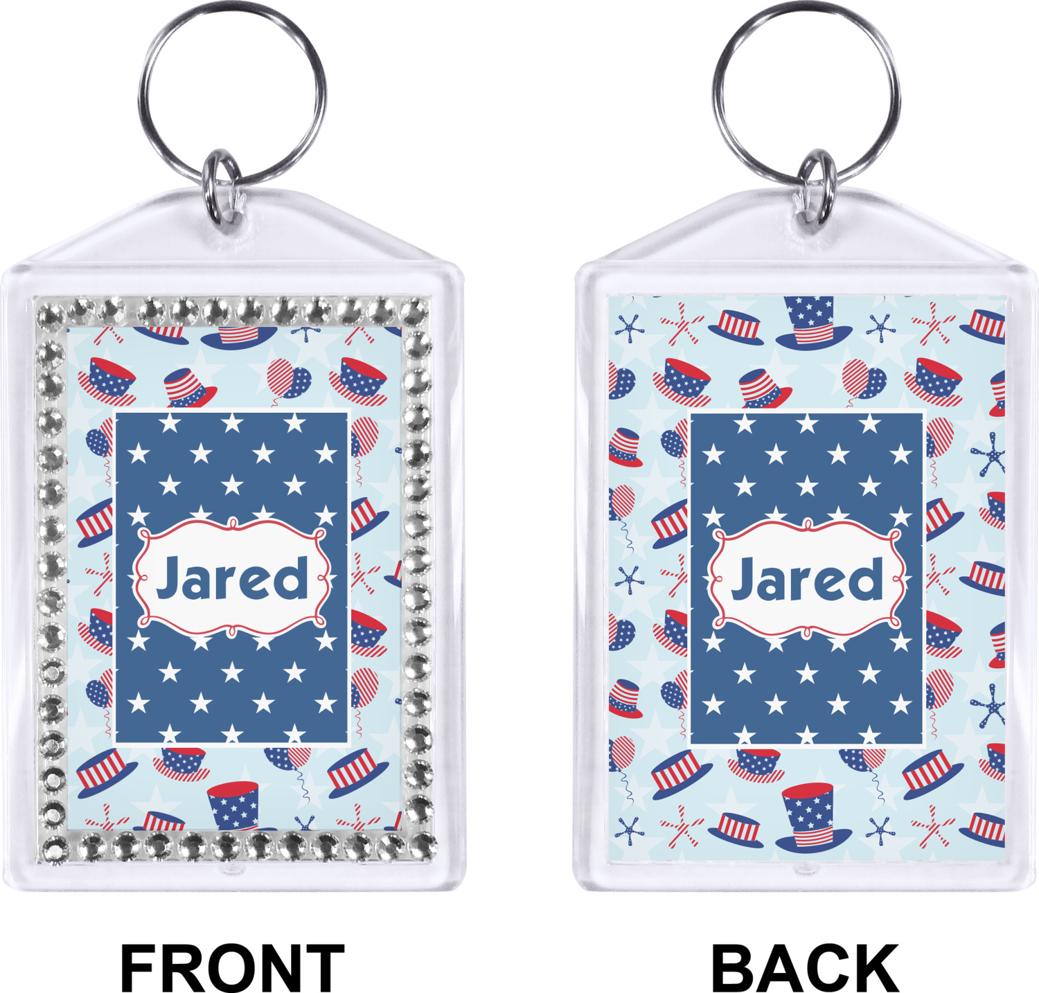 Our personalized keychains have a bold, rectangular shape, outlined by a series of shimmering rhinestones. A metal, split keyring is included with your purchase, and an additional metal hoop allows for attachment of the keychain to the split ring. This unique keychain measures at about 3.75 by 2.5 inches. We print your customized design(s) across both the back and front of this keychain.