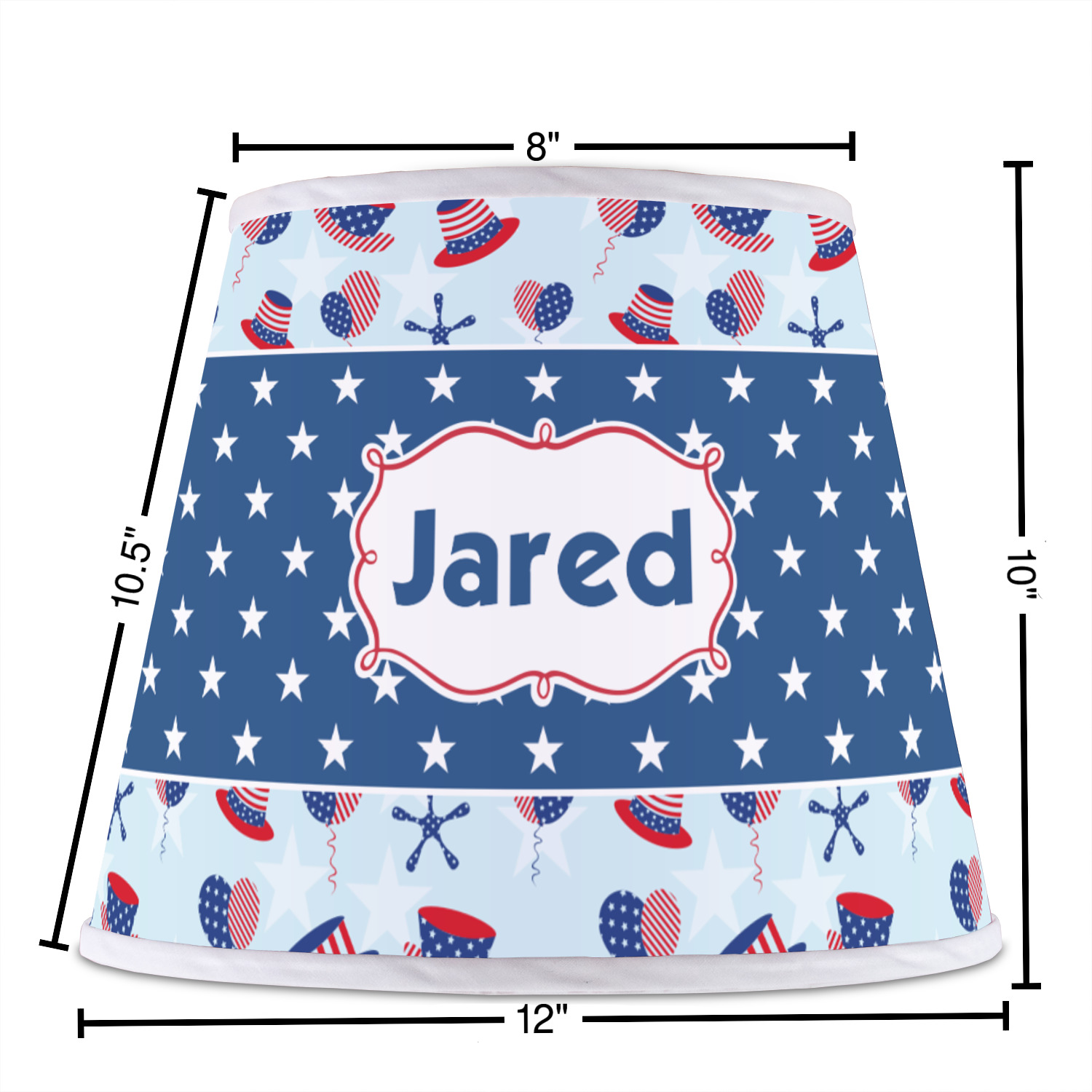 The base of this lampshade is 12 inches in diameter, and the top spans 8 inches in diameter. The total height of the lampshade is 10 inches. The angled nature of this custom lampshade concentrates the light, making it ideal for smaller spaces. This lampshade is made of matte, polyfilm, and displays your customization in its middle. The top and bottom of this colorful lamp shade are lined with a white fabric ribbon (which can be replaced with black inside the design studio) which frames your design and creates a sophisticated finish. As an UNO fitter lampshade, this unique lamp shade will fit a variety of bases.