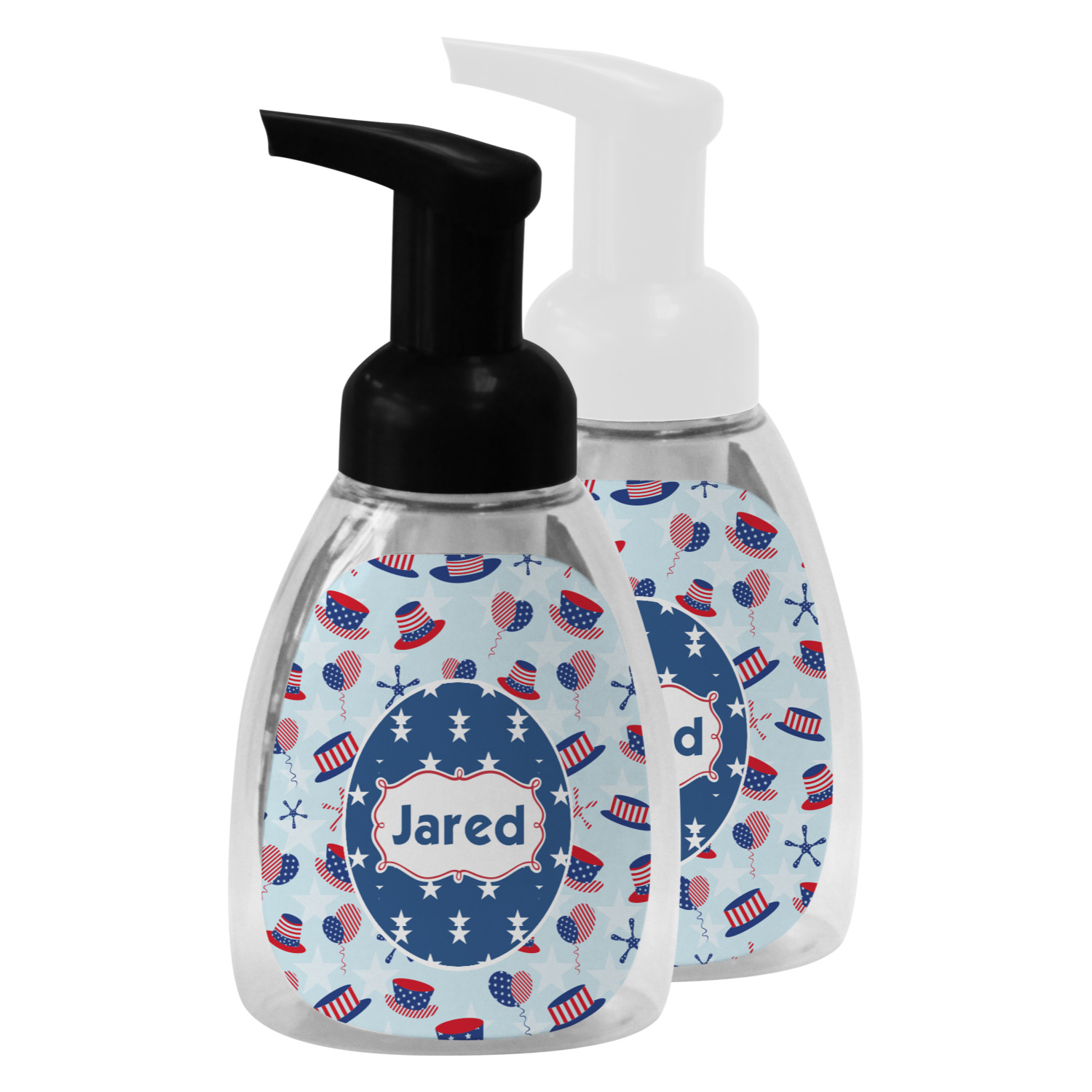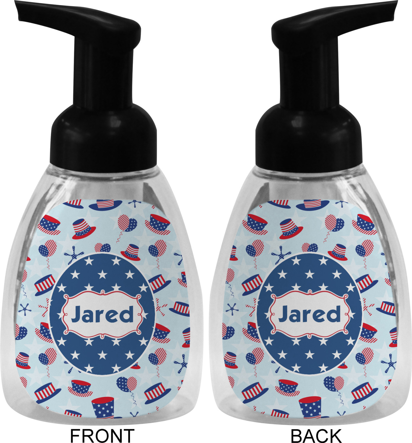 This soap dispenser is made of a robust plastic and has a clear base. The included soap pump is available in black or white color. This dispenser is 6.5 inches tall, 3 inches wide, and 2 inches deep. We display your customized designs on the front and back sides of these foaming hand soap dispensers.