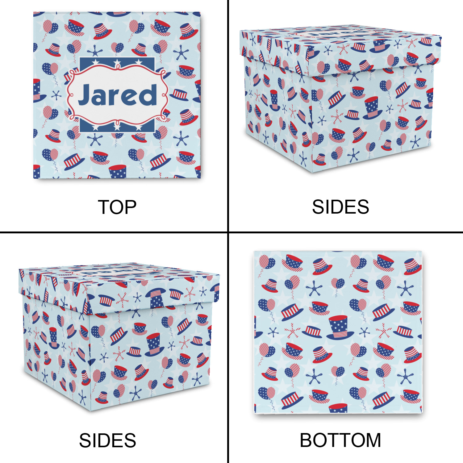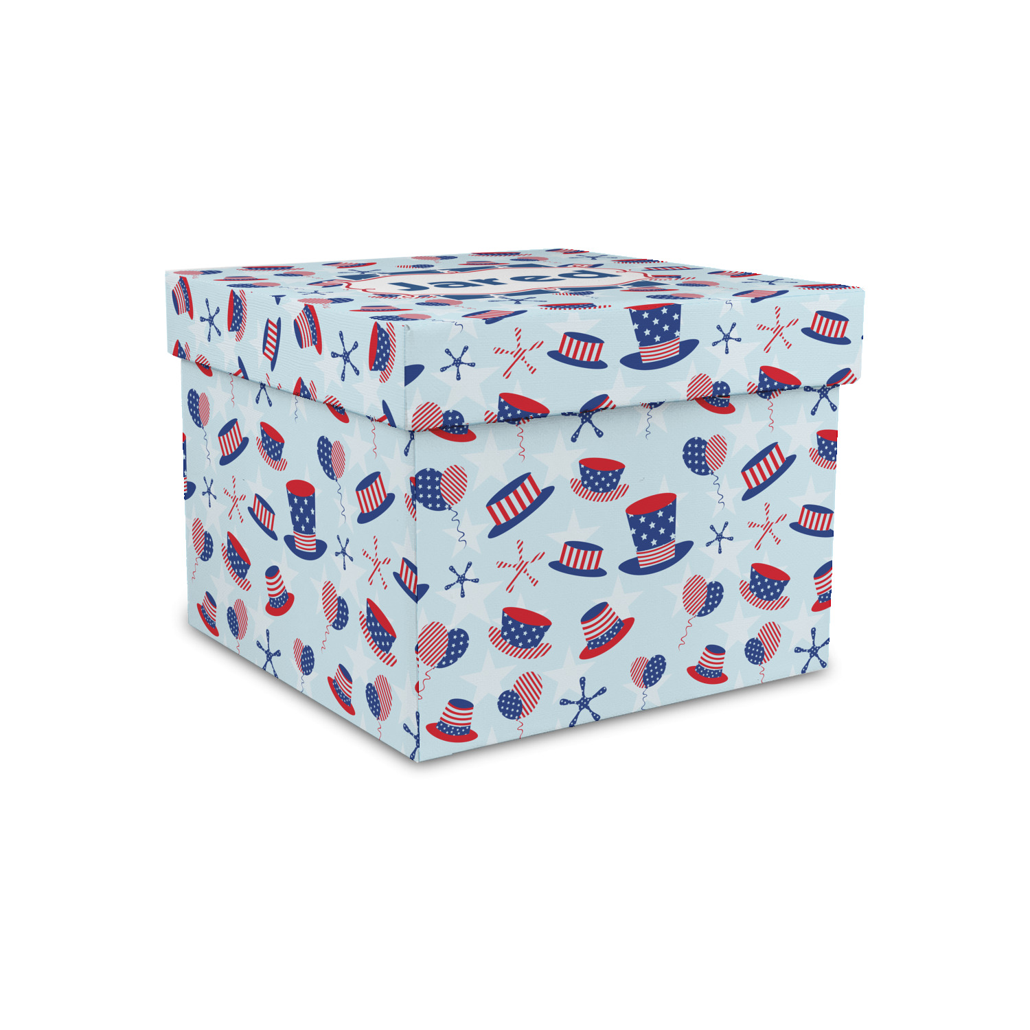 Patriotic Celebration is a fun pattern with red, white, and blue striped and starred hats and balloons. The light blue background really makes these design elements pop! A navy and white star pattern is used as a secondary pattern to add some contrast.
