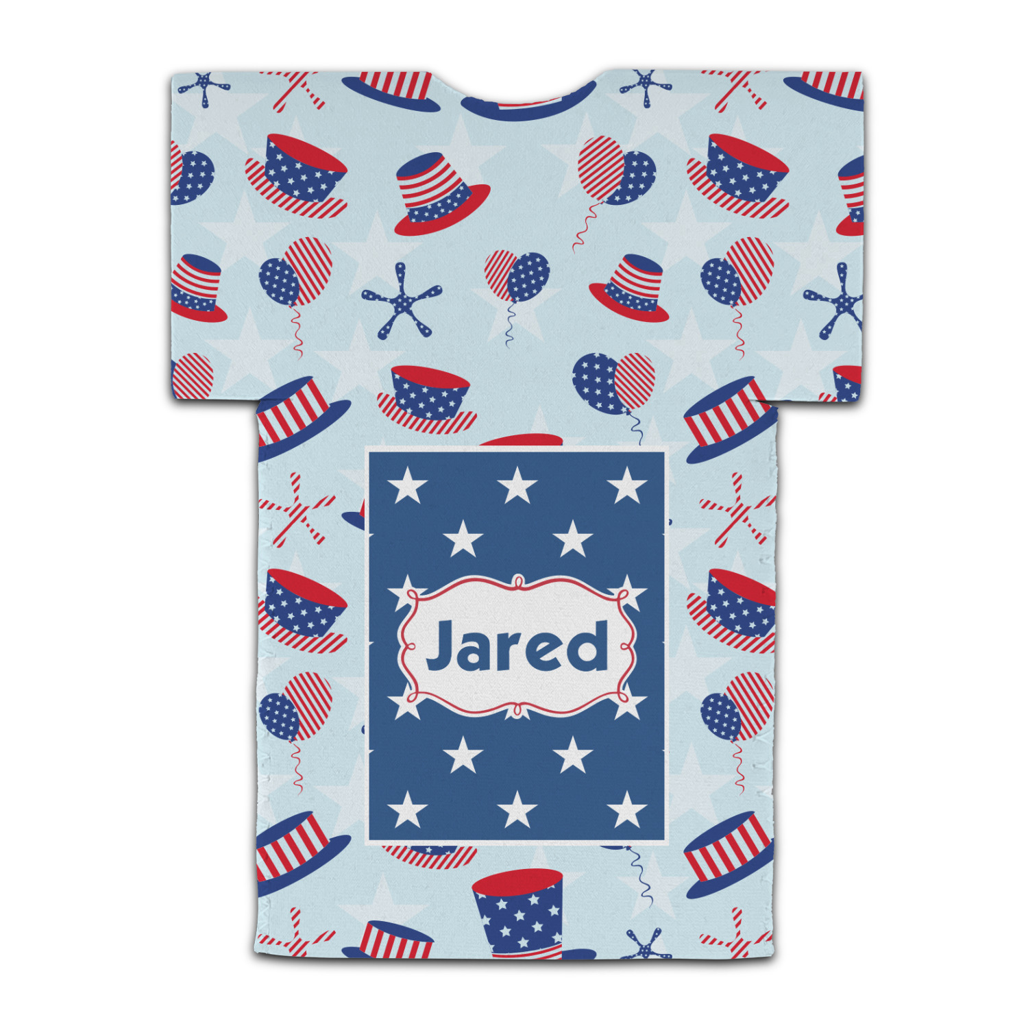 Patriotic Celebration is a fun pattern with red, white, and blue striped and starred hats and balloons. The light blue background really makes these design elements pop! A navy and white star pattern is used as a secondary pattern to add some contrast.